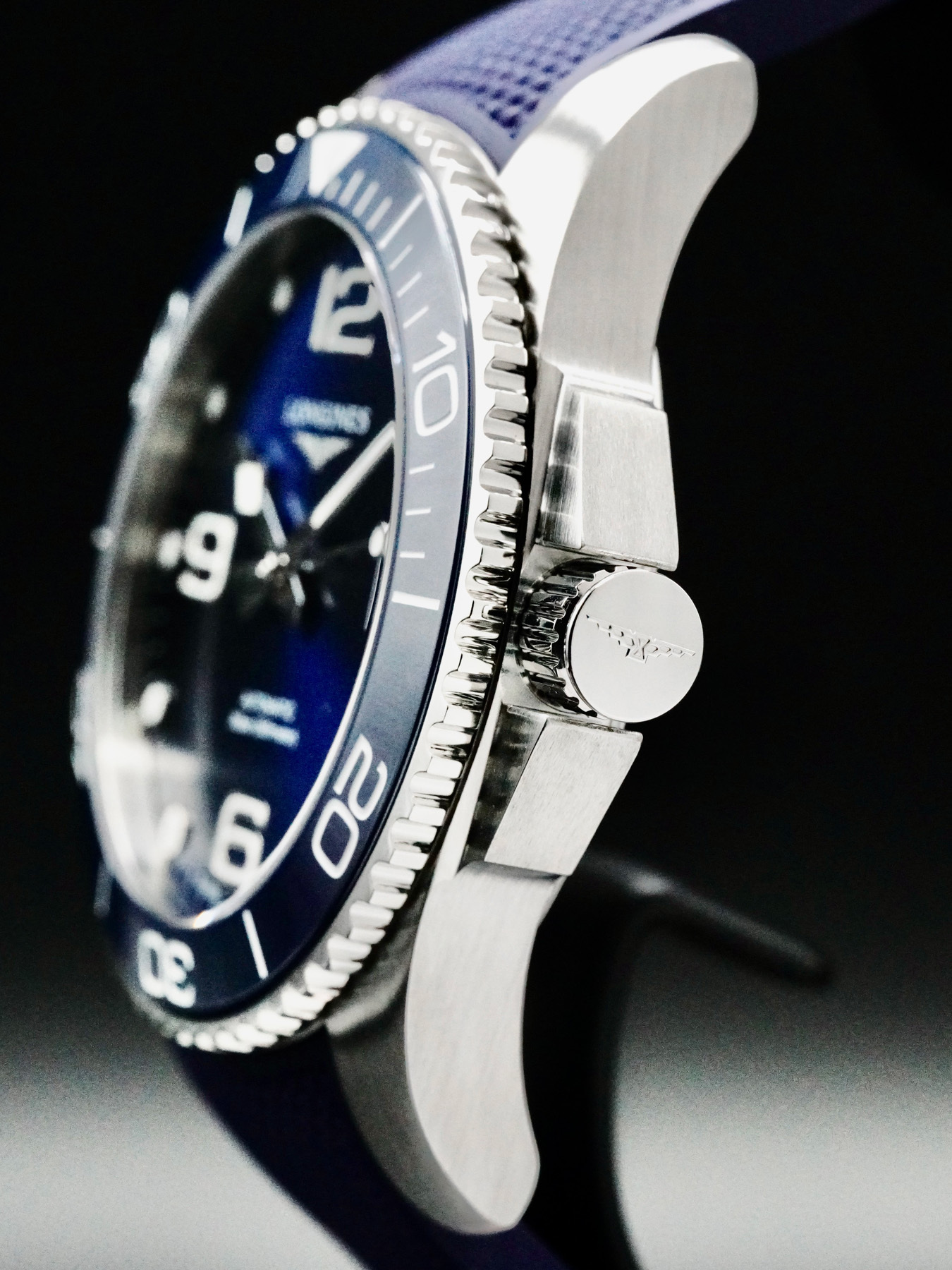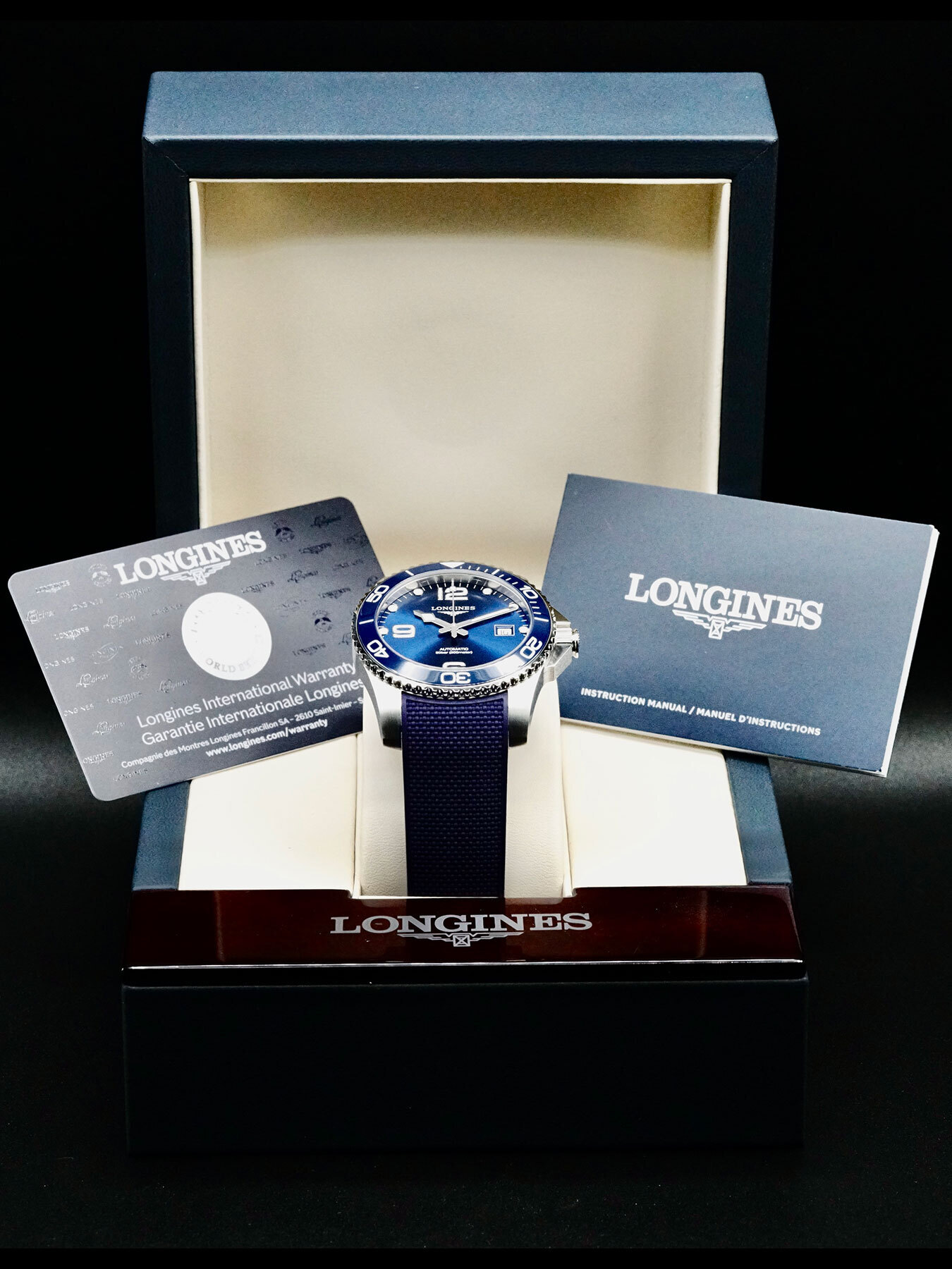 This Longines Hydroconquest Blue L3.781.4.96.9 is in EXCELLENT condition. This watch includes its original box, instruction manual, and warranty card dated for September 2023. This watch has been fully authenticated and certified by Exquisite Timepieces.