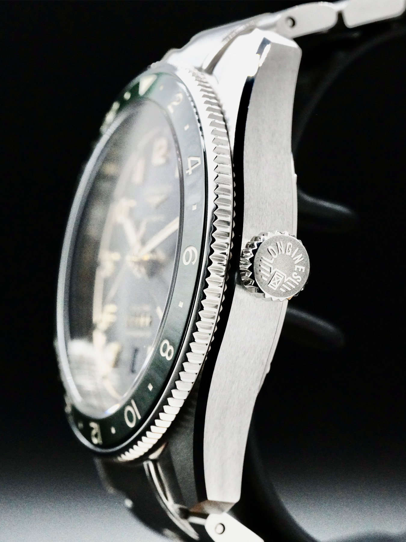 This Longines Spirit features a 42mm stainless steel case with a green ceramic bezel on a stainless steel bracelet. This watch also sports a black anthracite dial with gold polished hands and Arabic numeral dial markers covered by scratch resistant sapphire crystal.