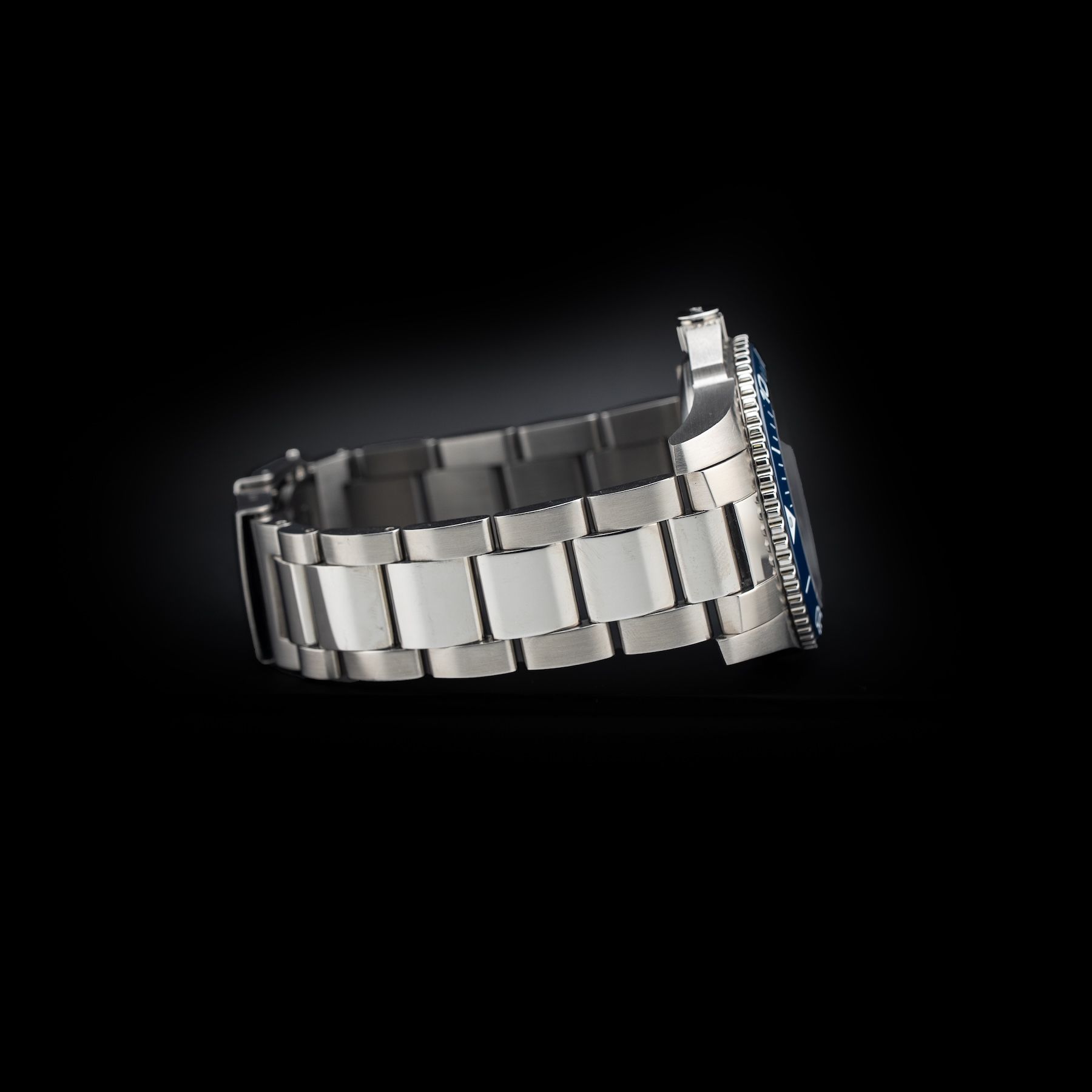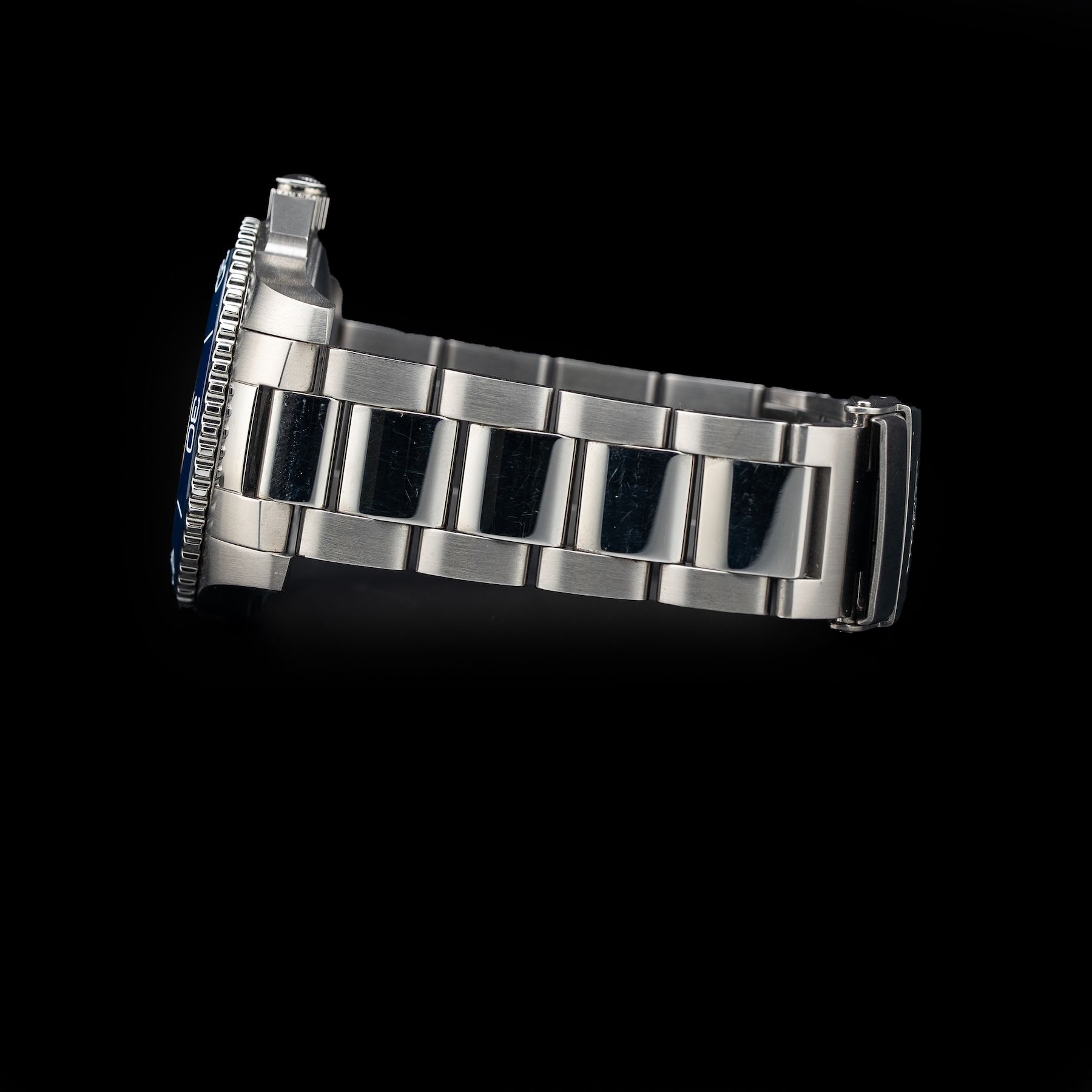 This watch features a 41mm stainless steel & ceramiccase on stainless steel bracelet. This watch also sports a blue dial. Powered by a mechanical automatic movement. Water resistance up to 300 meters.