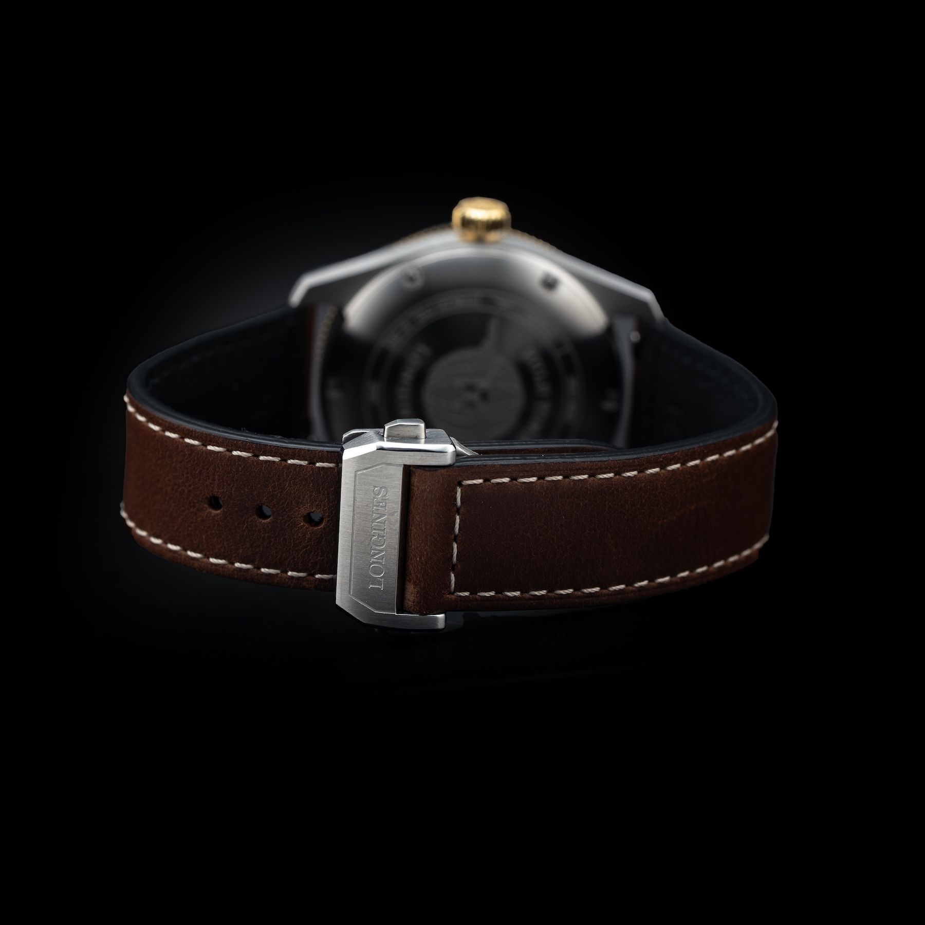 This watch features a 39mm Stainless Steel and 18k Yellow Gold case on leather strap. This watch also sports a black dial. Powered by a mechanical automatic movement. Water resistance up to 100 meters.