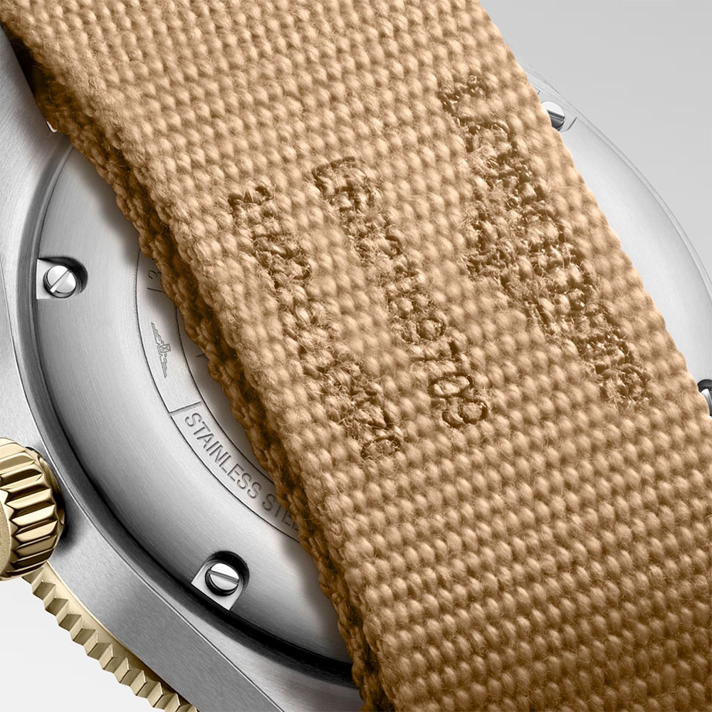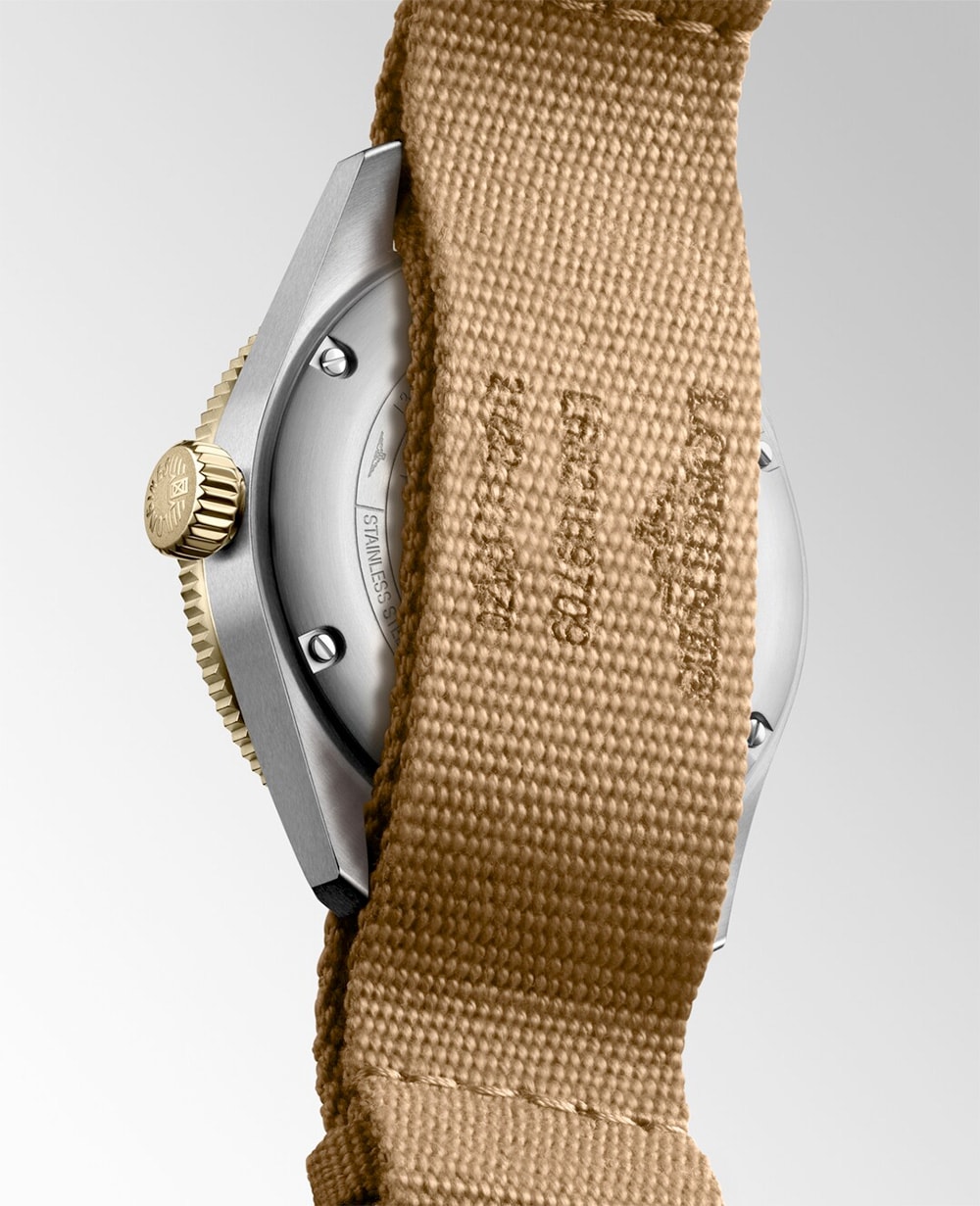 This model features a bezel in yellow gold enhanced with a chocolate brown ceramic insert, and is available on a sandblasted anthracite dial, with a date window centred at the 6 o'clock position. The 39 mm steel case has a brown NATO strap.