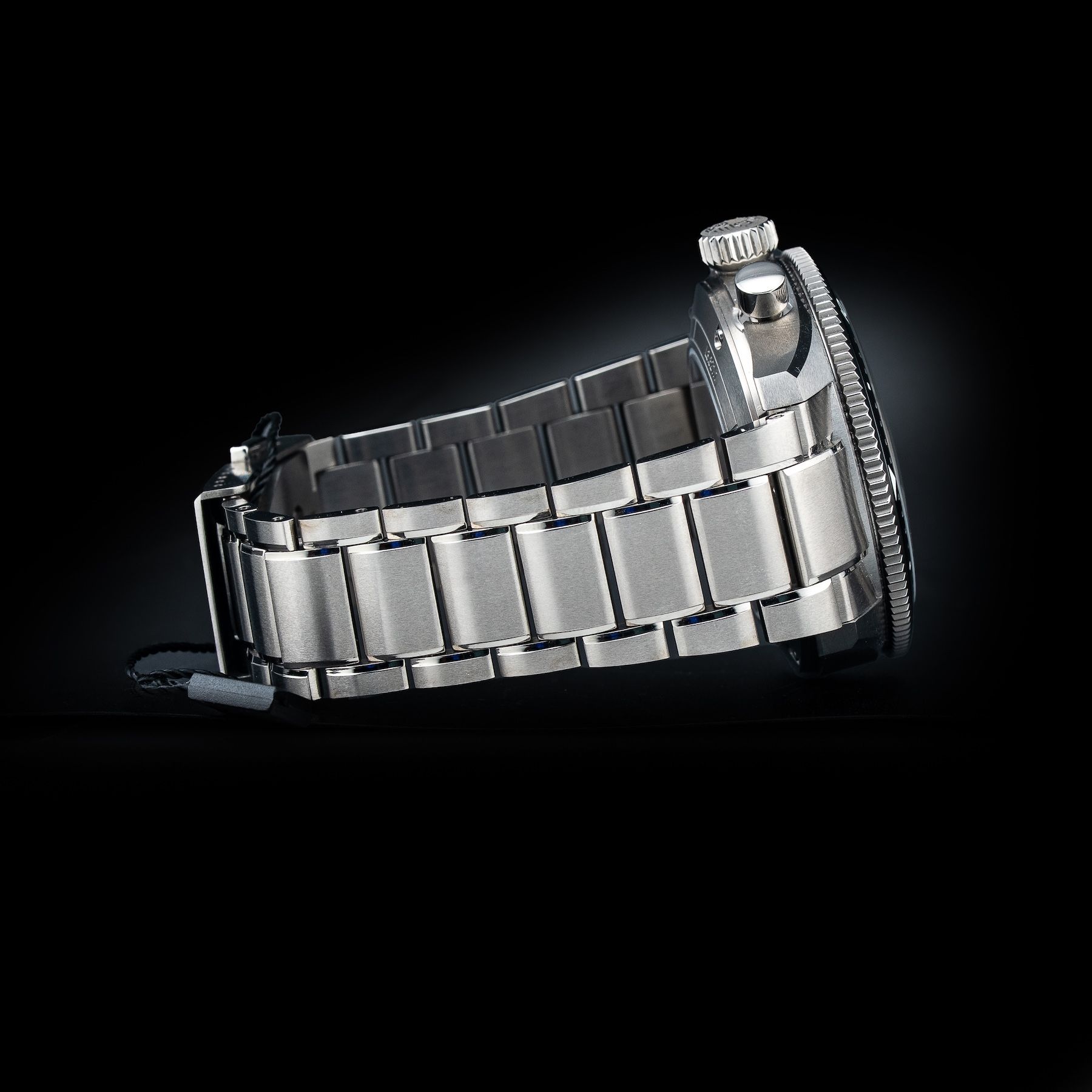 This watch features a 42mm titanium case on titanium bracelet. This watch also sports an anthracite dial. Powered by a self winding mechanical movement. Water resistance up to 100 meters.