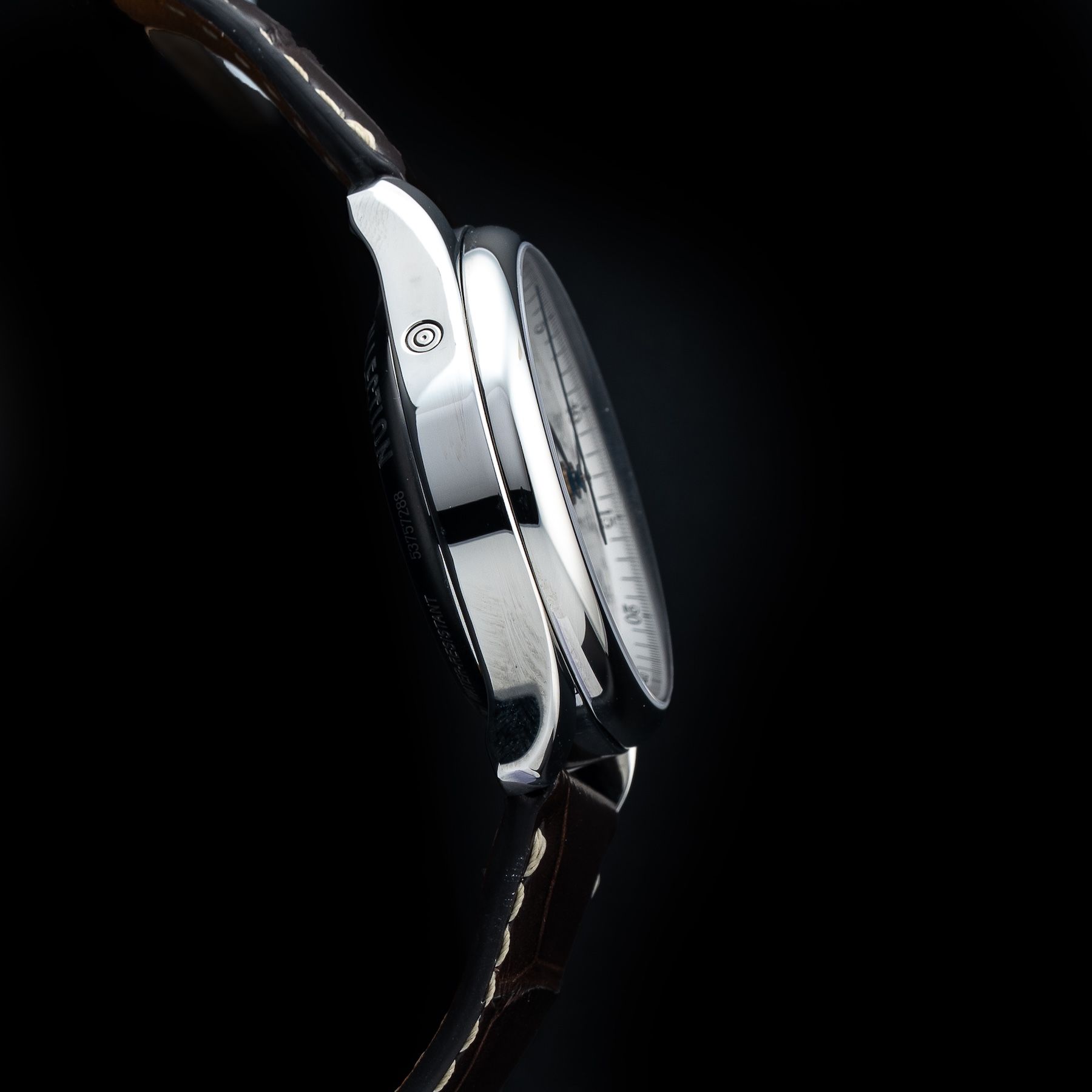 This watch features a 40mm stainless steel case on leather strap. This watch also sports a silver dial. Powered by a Swiss made automatic movement. Water resistance up to 30 meters.