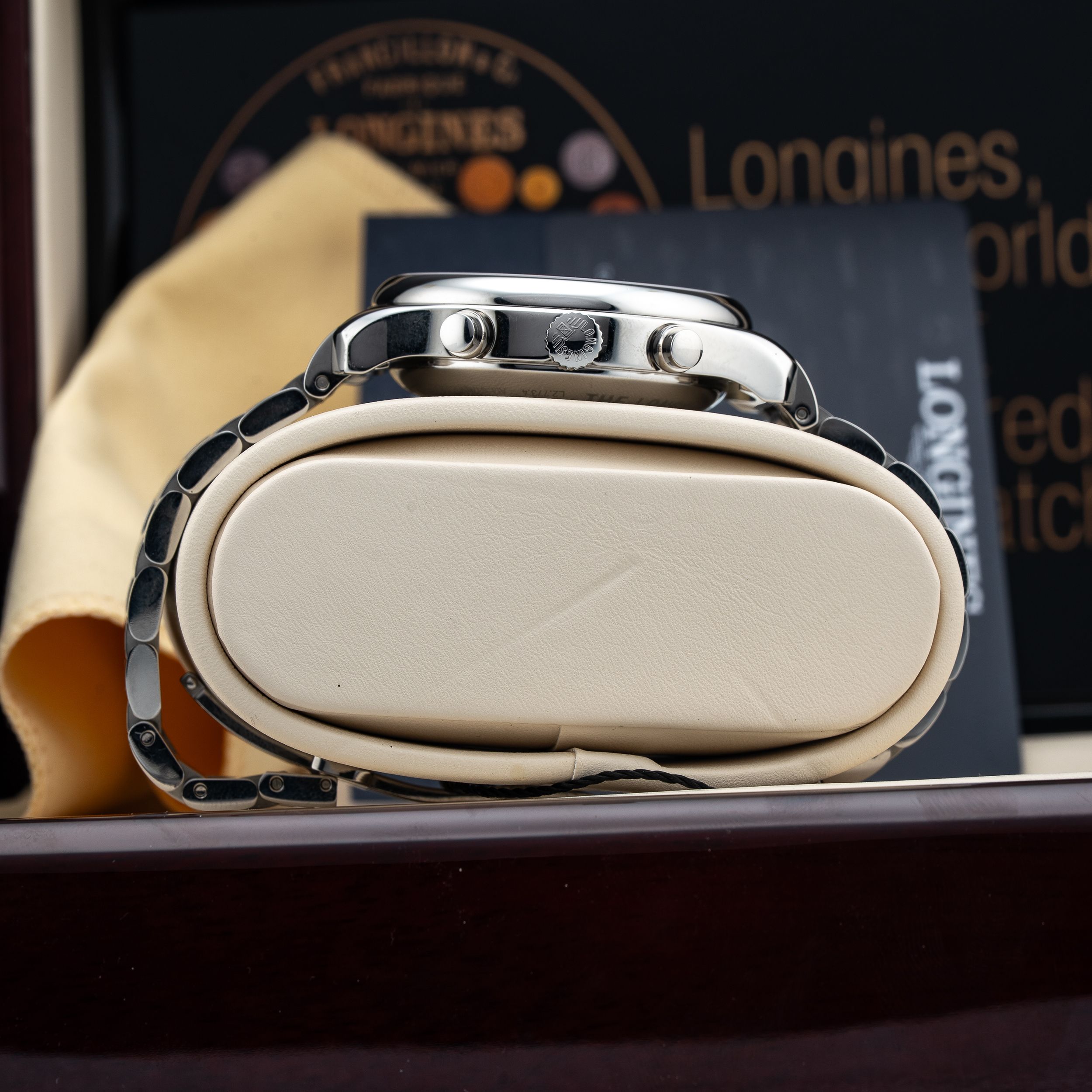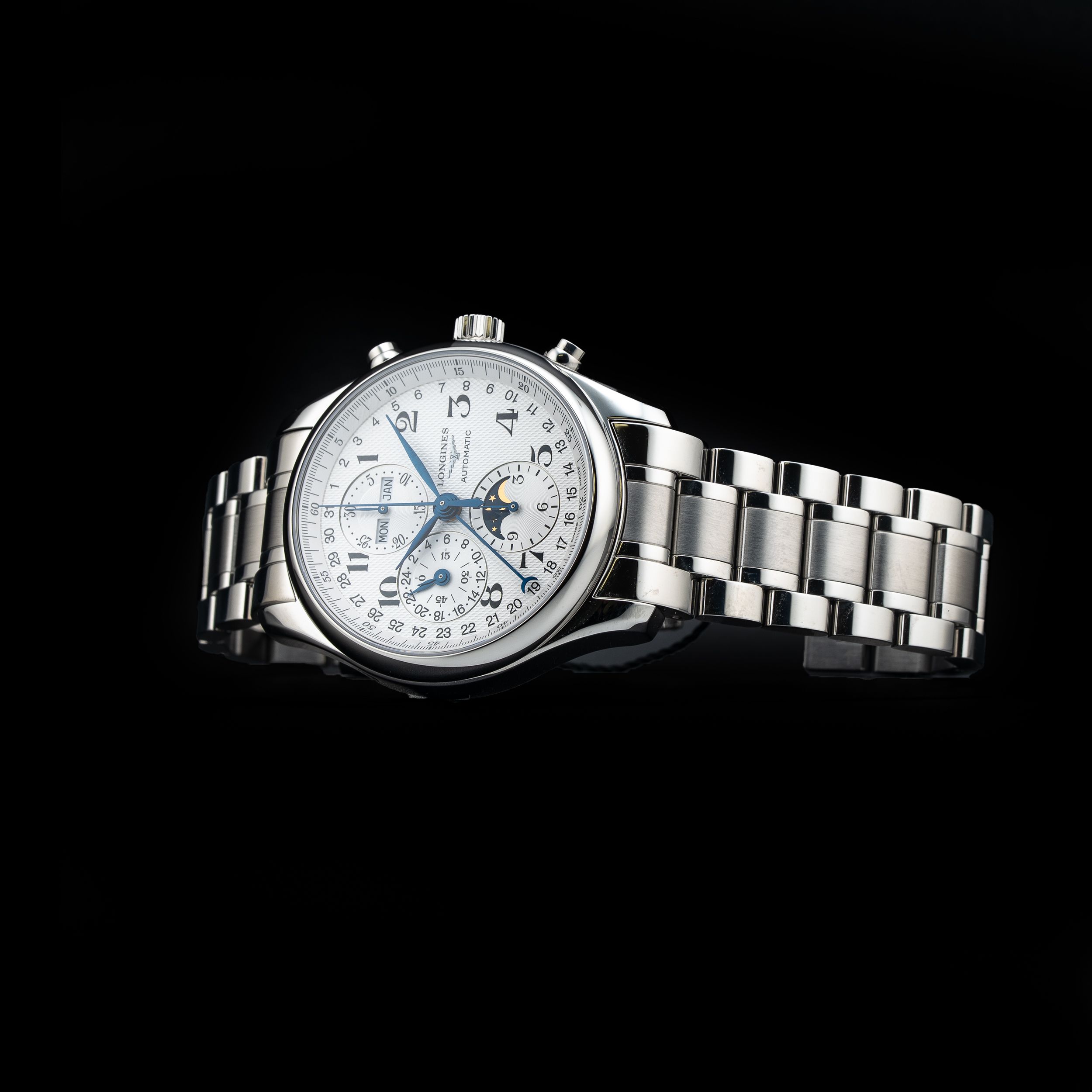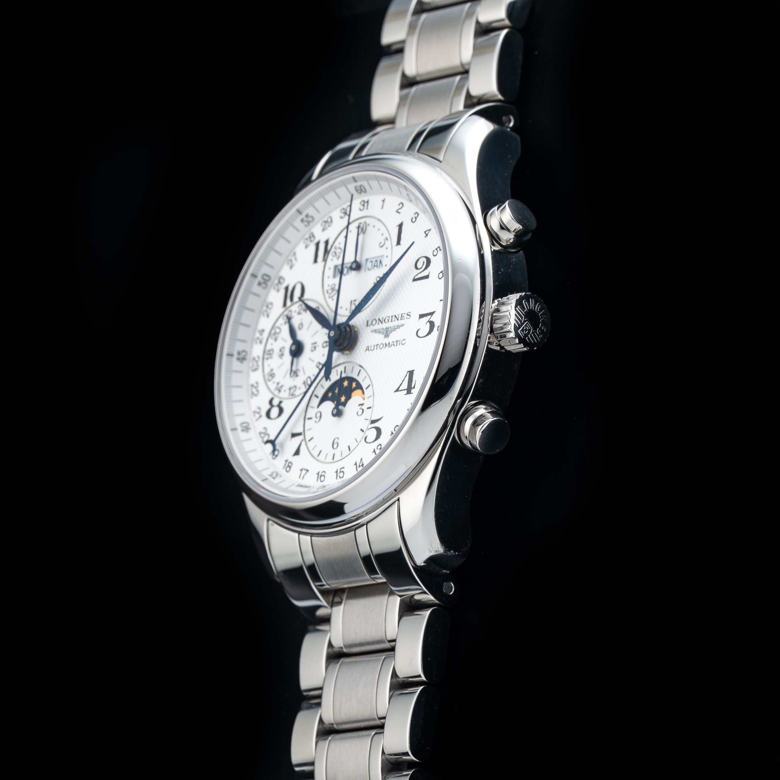 This Longines Master Collection Chronograph Moonphases L2.773.4.78.6 is in GREAT condition. This watch includes its Original Box, Original Papers and Warranty Card Dated 01/16/2026. This watch has been fully authenticated and certified by Exquisite Timepieces. Please note, the photos shown are of the actual watch you will receive.