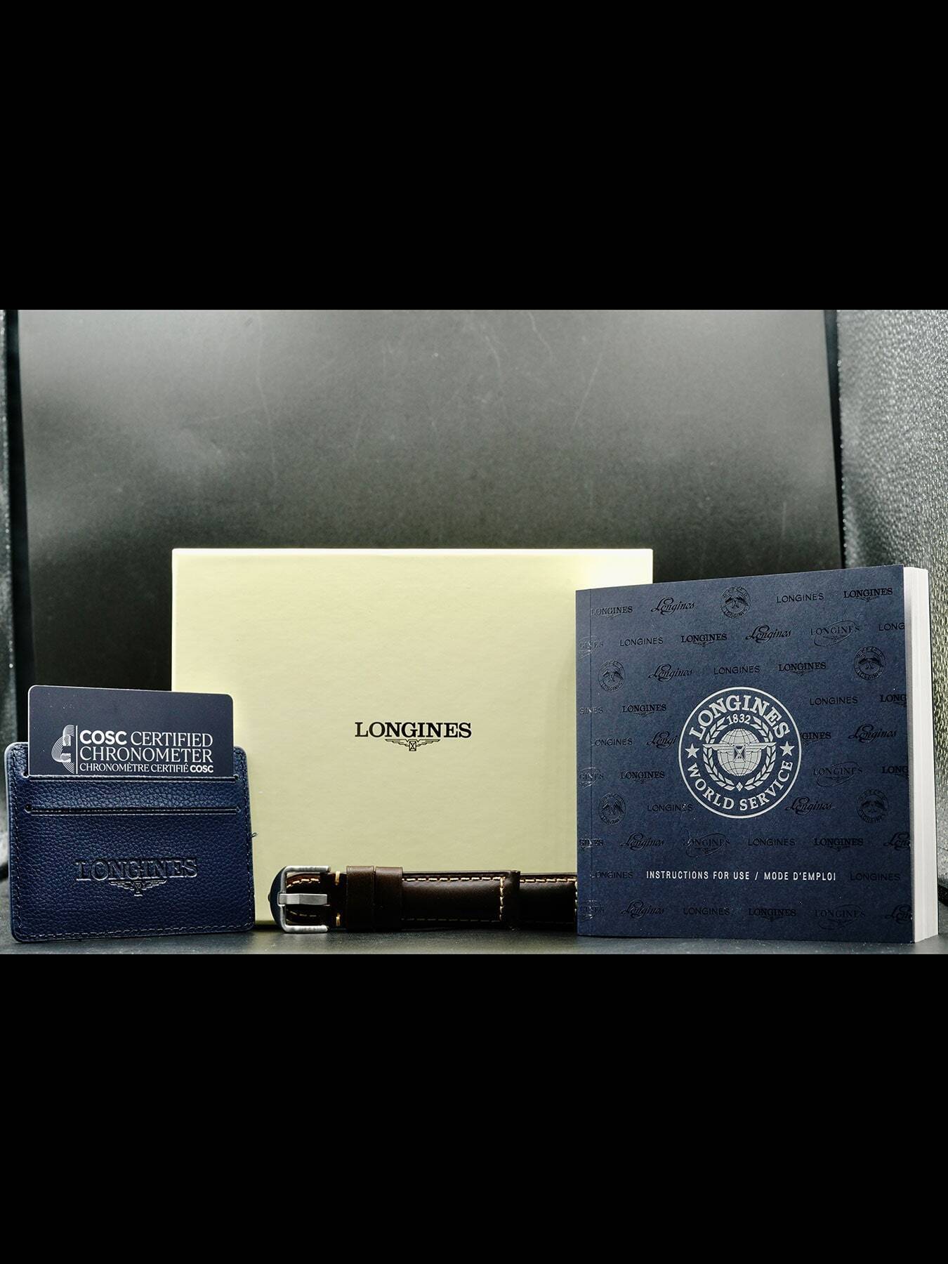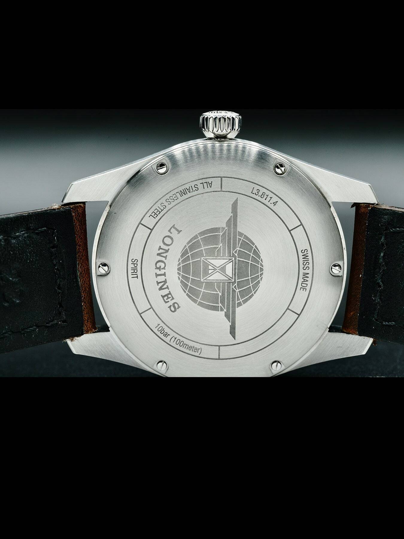 This Longines Spirit L3.811.4.03.2 is in EXCELLENT condition. This watch includes its original box, instruction manual, customer service booklet, and international warranty dated for June 2022. Extra brown leather strap.