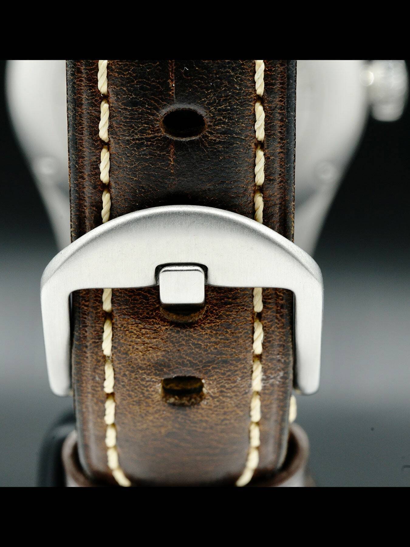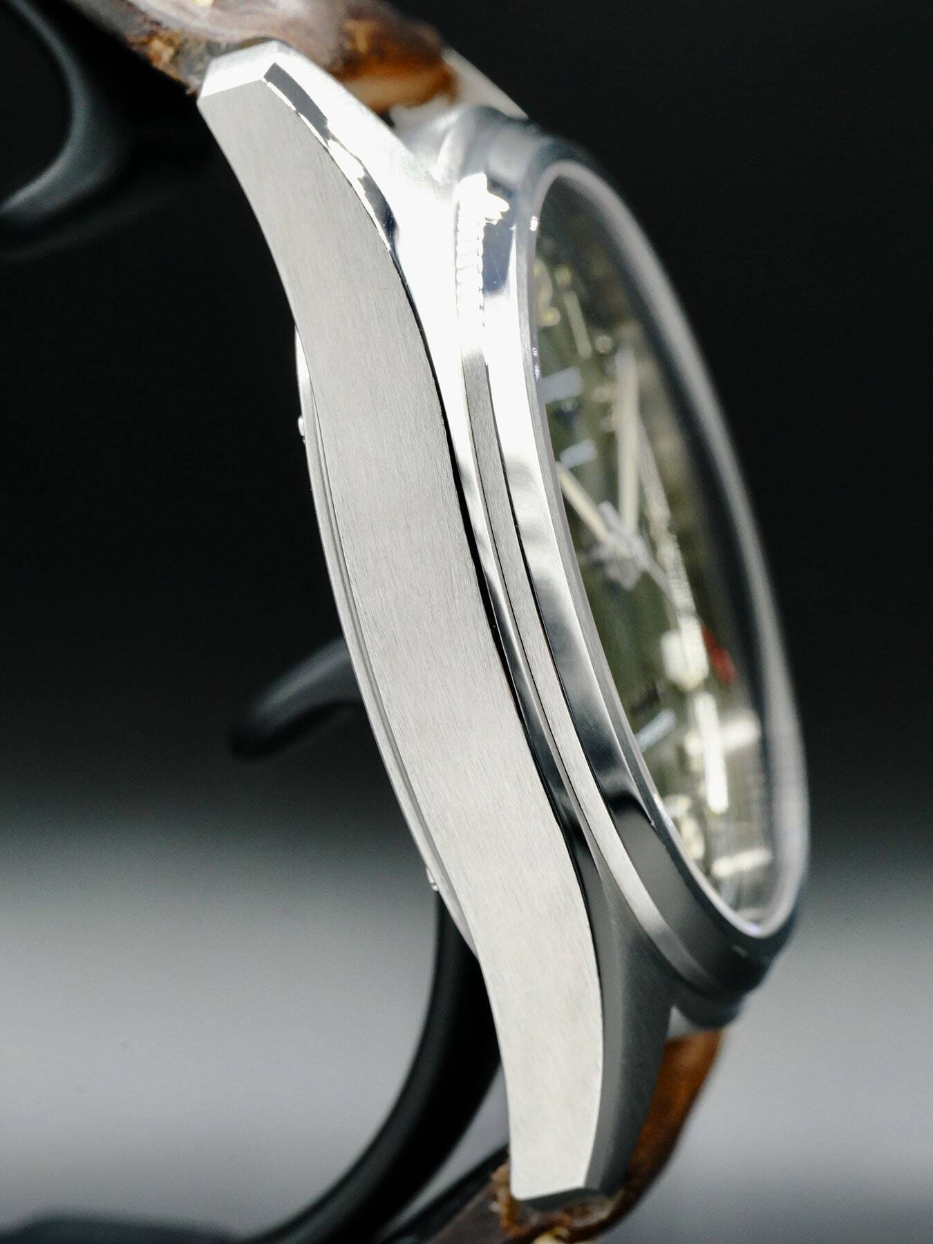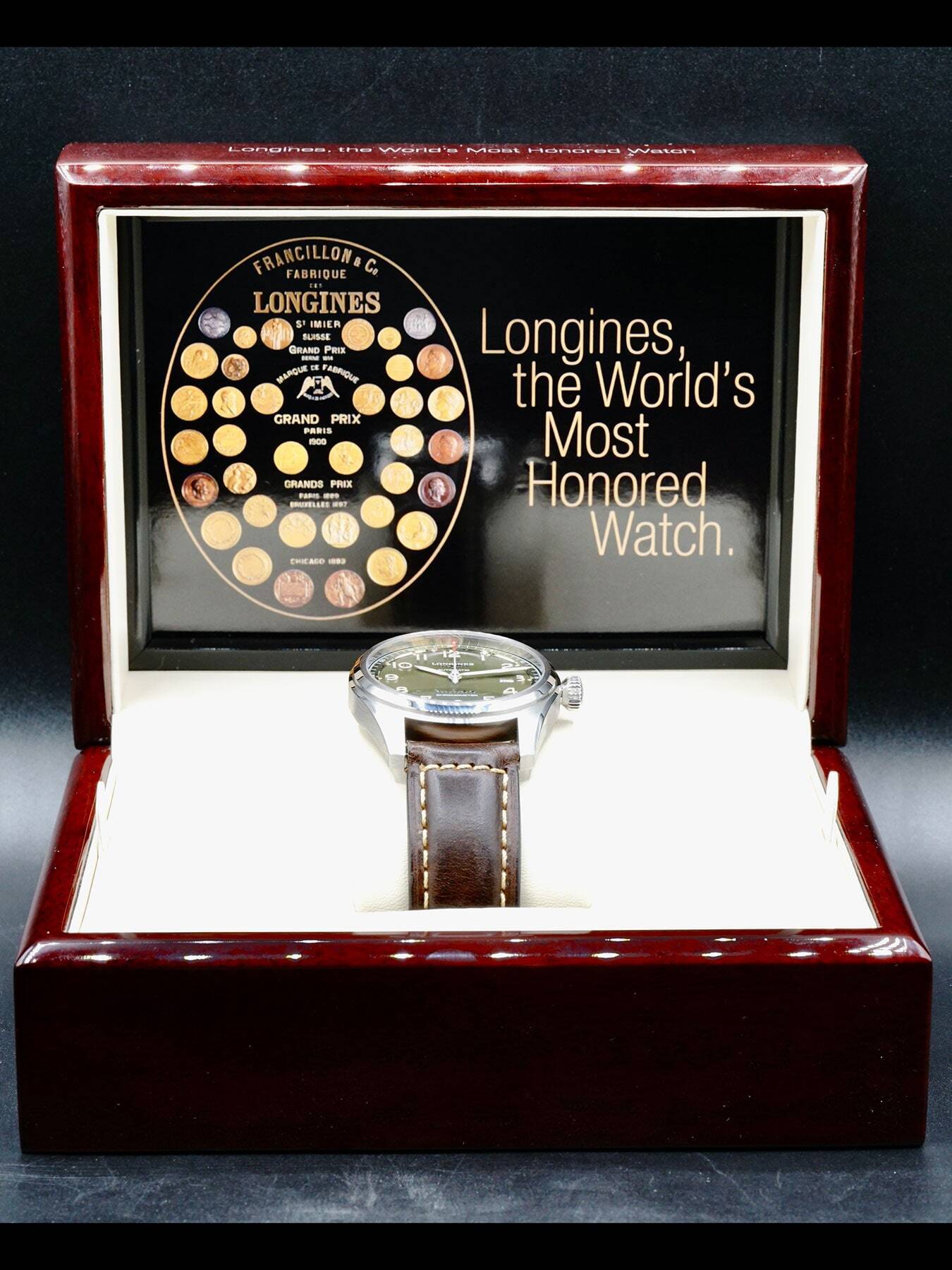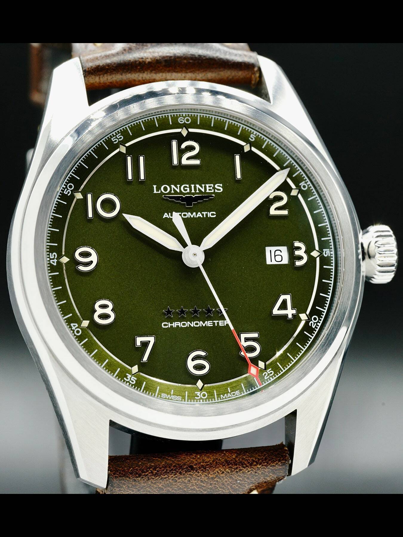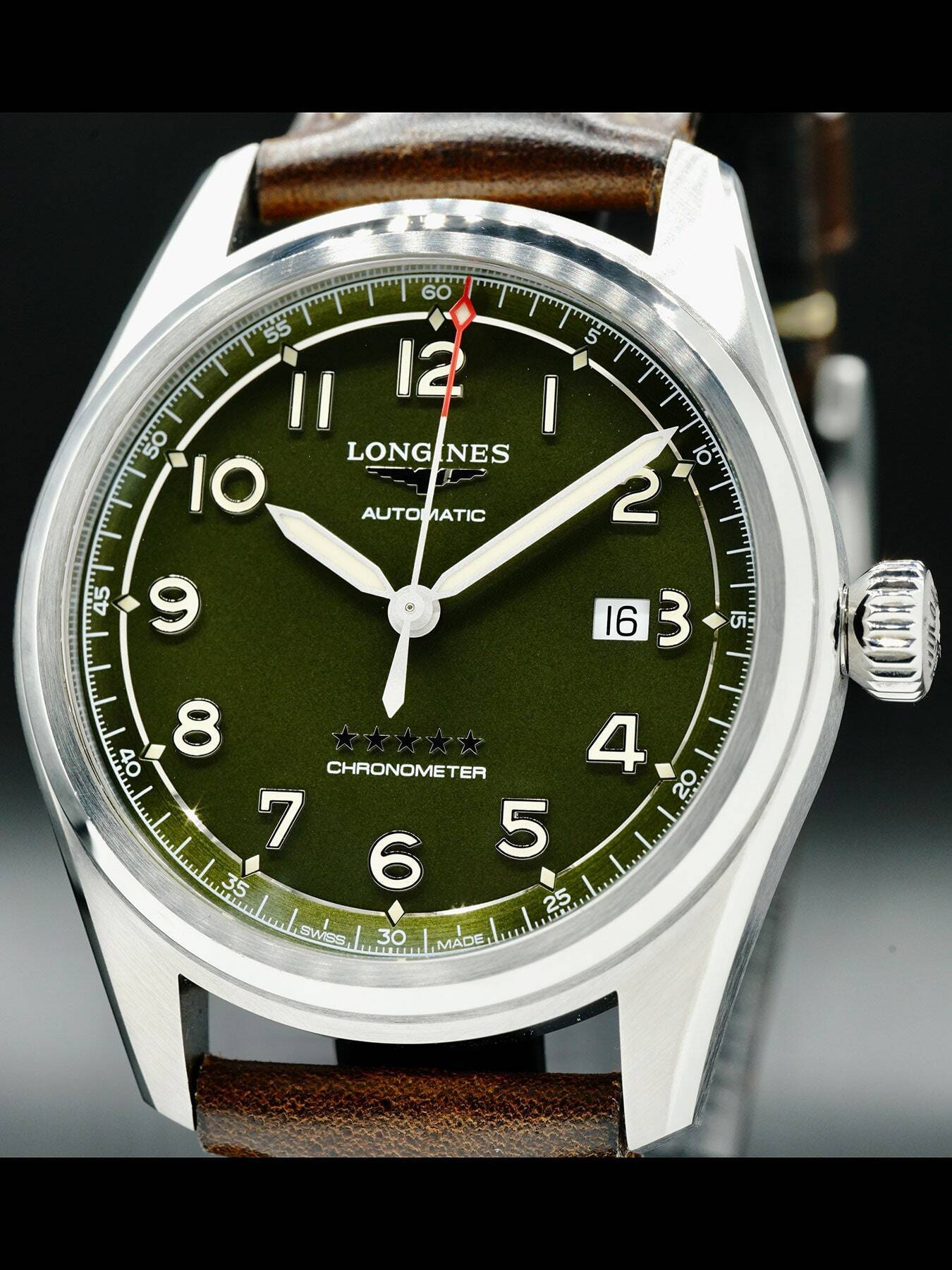 This Longines Spirit features a 42mm stainless steel case with a solid case back on a brown leather strap. This watch also sports a green dial with Superluminova silvered sandblasted hands and Arabic numeral dial markers covered by scratch resistant sapphire crystal.