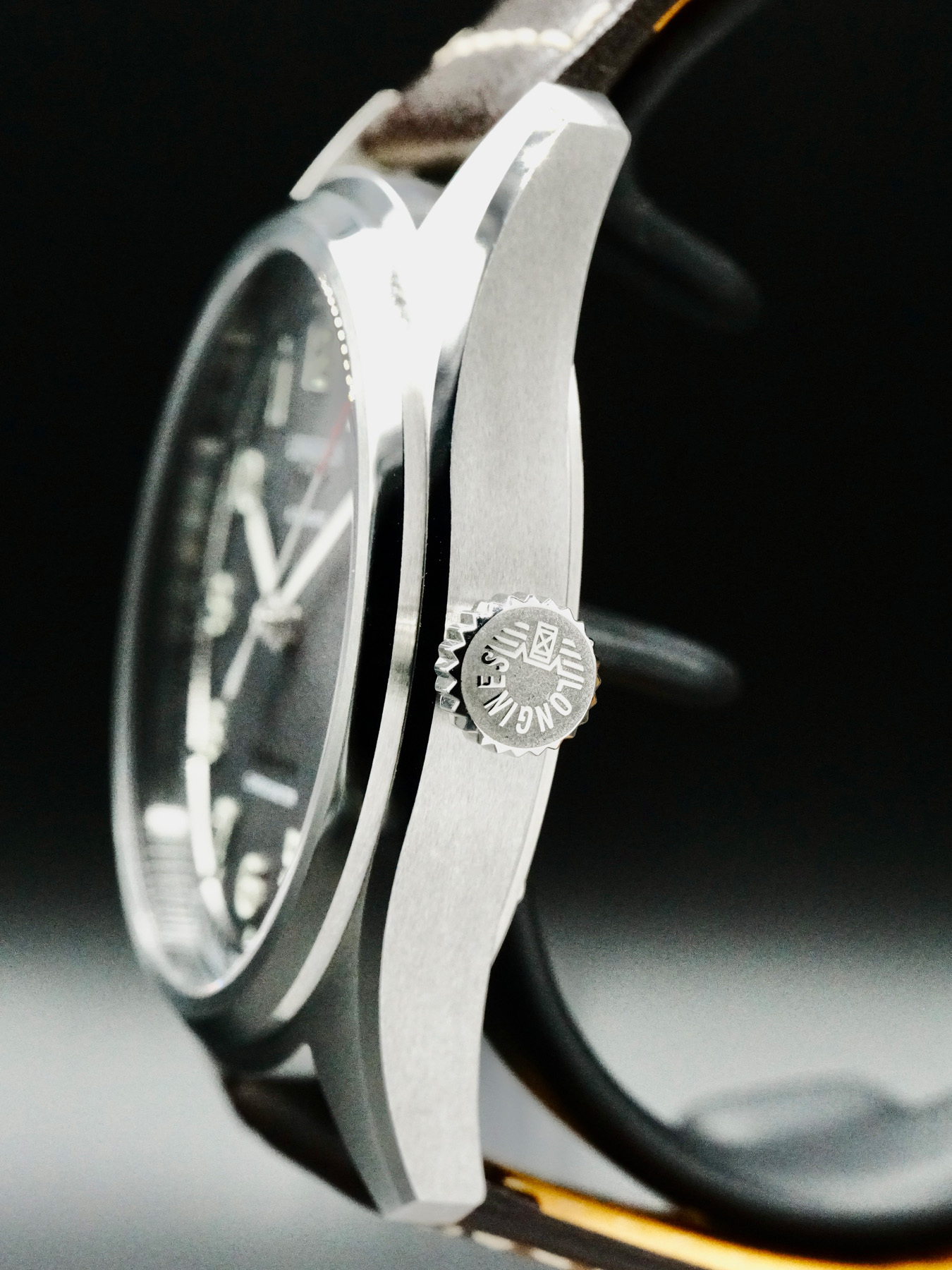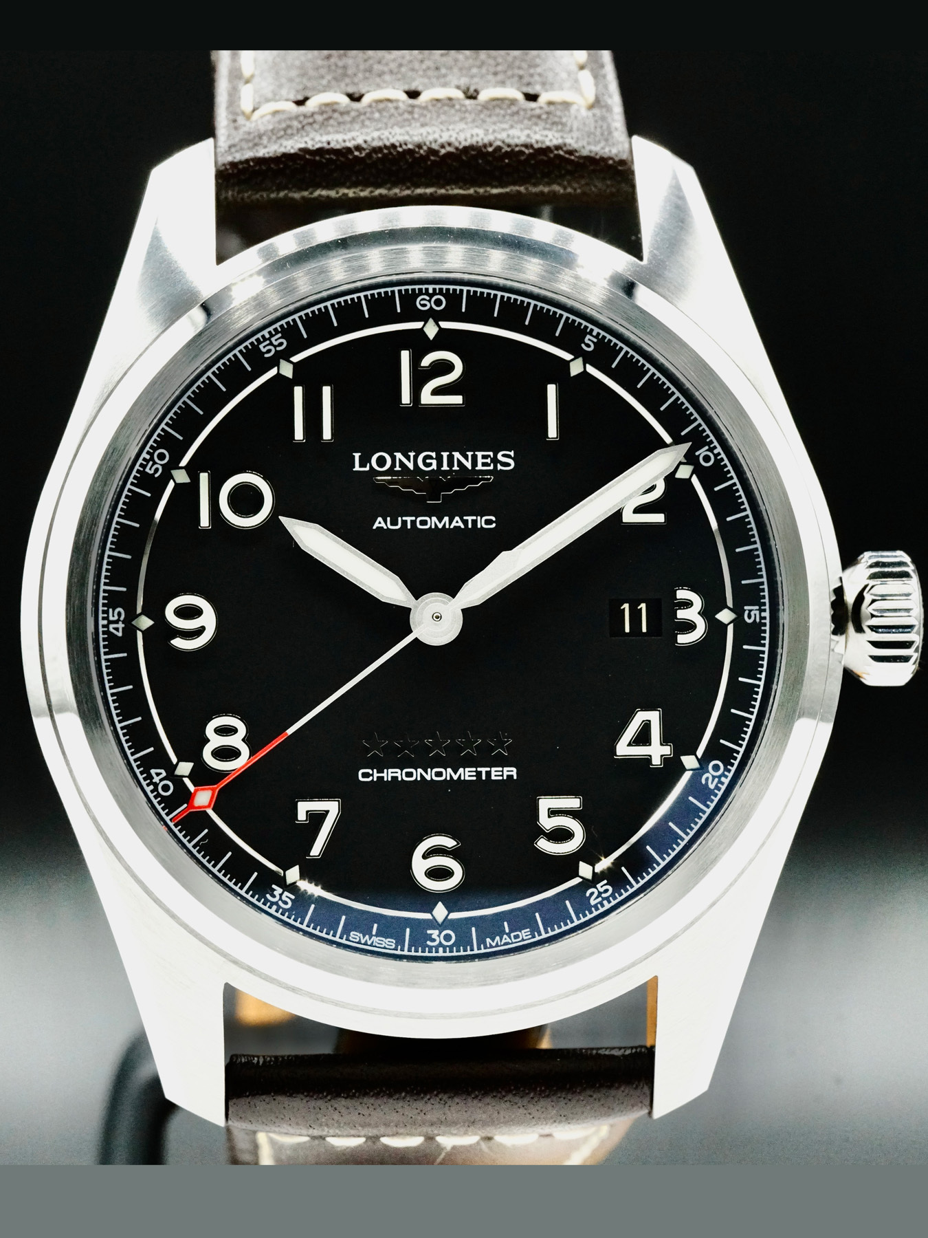 This Longines Spirit features a 42mm stainless steel case with a solid case back on a brown leather strap. This watch also sports a black dial with luminous hands and Arabic numeral dial markers covered by scratch resistant sapphire crystal.