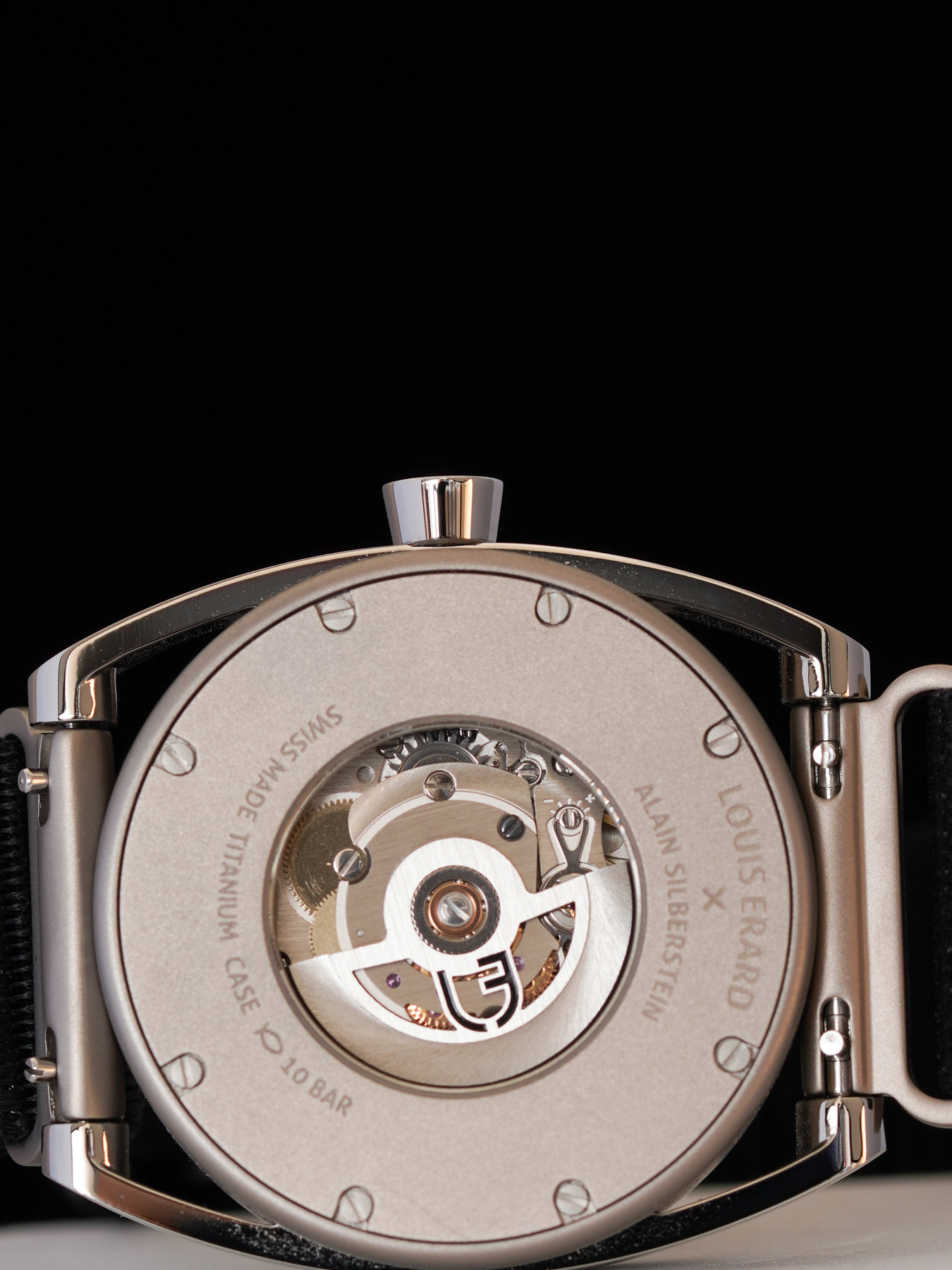 This watch features a 40mm titanium case on nylon strap. This watch also sports a black dial. Powered by a mechanical automatic movement. Water resistance up to 100 meters.