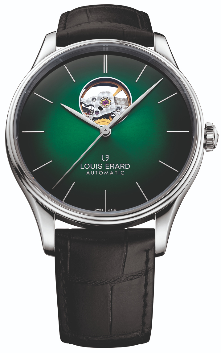 The very essence of a timepiece – hours, minutes and seconds – can be made even more remarkable, as LOUIS ERARD shows with this creation. The eye lingers at 12 o’clock, where the openwork dial allows a glimpse on the automatic movement below. Inspired by nature and the purity of the Swiss Jura, a green sunburst dial that shades off progressively to black on the contour gives depth and intensity to this characterful Héritage.