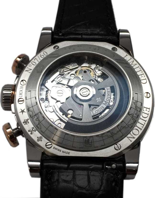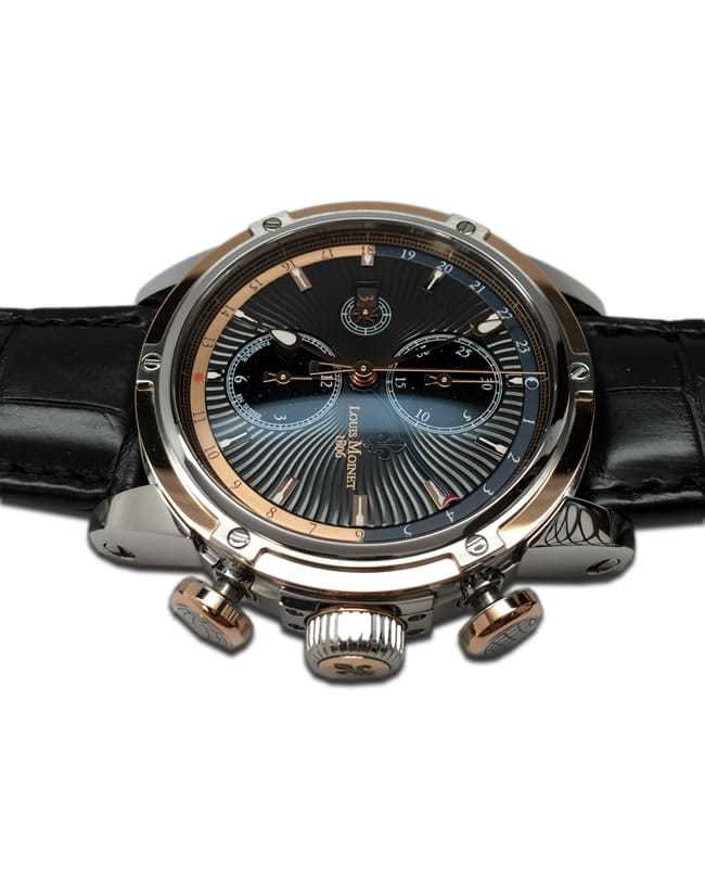 The Geograph Globe is poised to be the successor to the Rainforest limited edition, which has almost completely sold out. The piece features two incredibly slim aventurine dials – o.5 mm thick – on which any work is a perilous exercice. Just sixty such watches will be made.The Geograph is one of the timepieces which have created the Louis Moinet ethos, boasting the three essential characteristics in this respect: a chronograph; a powerful, creative style; and dials made out of a rare mineral. These three components were the starting-point for Louis Moinet, and they are coming into play once again with the Geograph to write a fresh page in the firm’s history with a new version: the Geograph Globe.