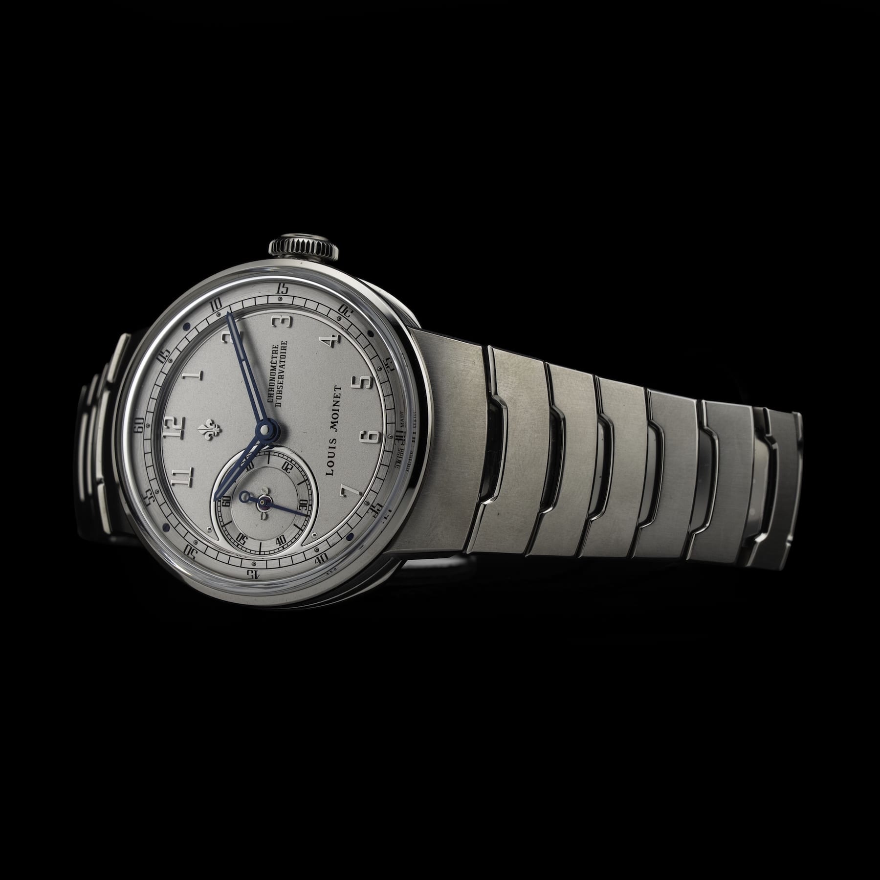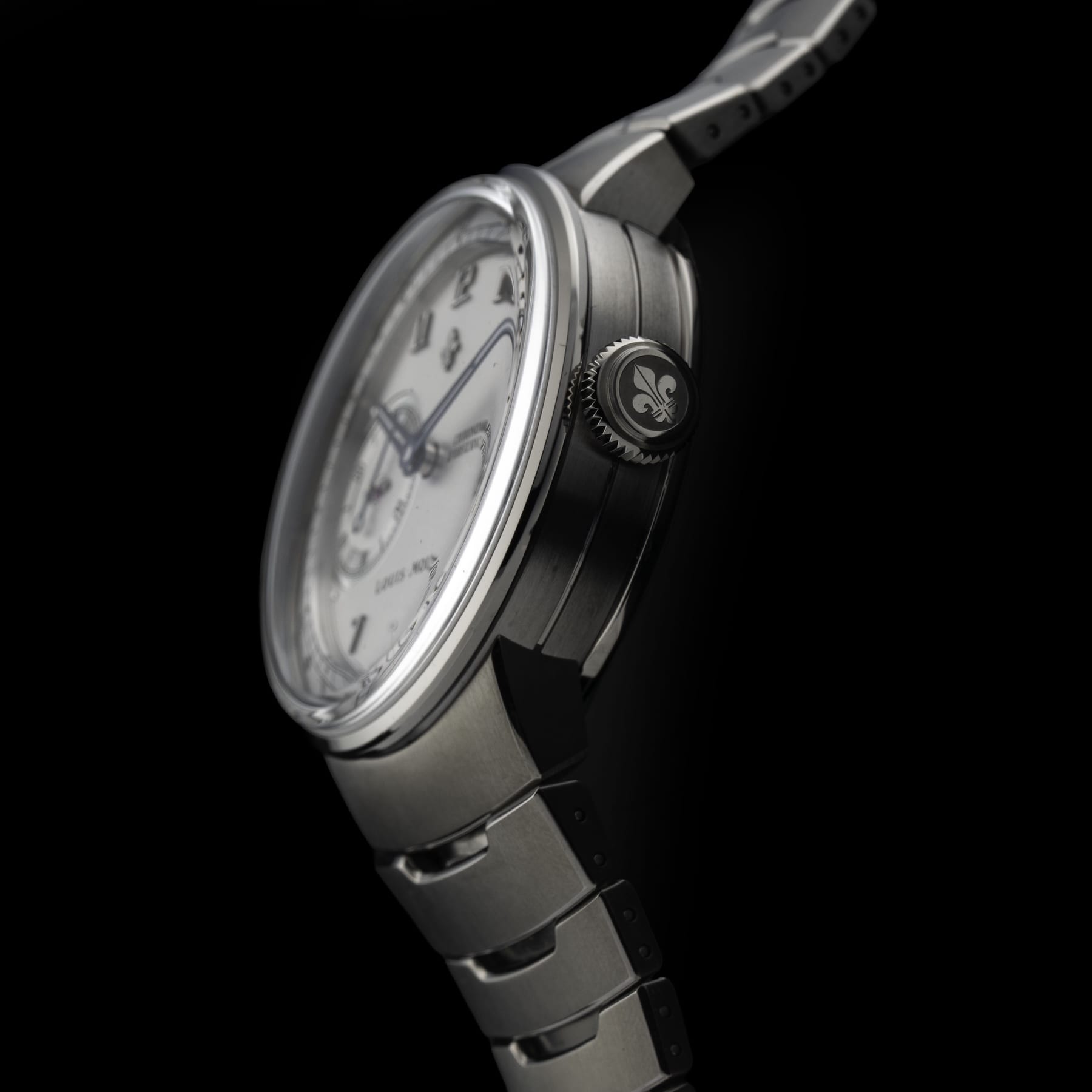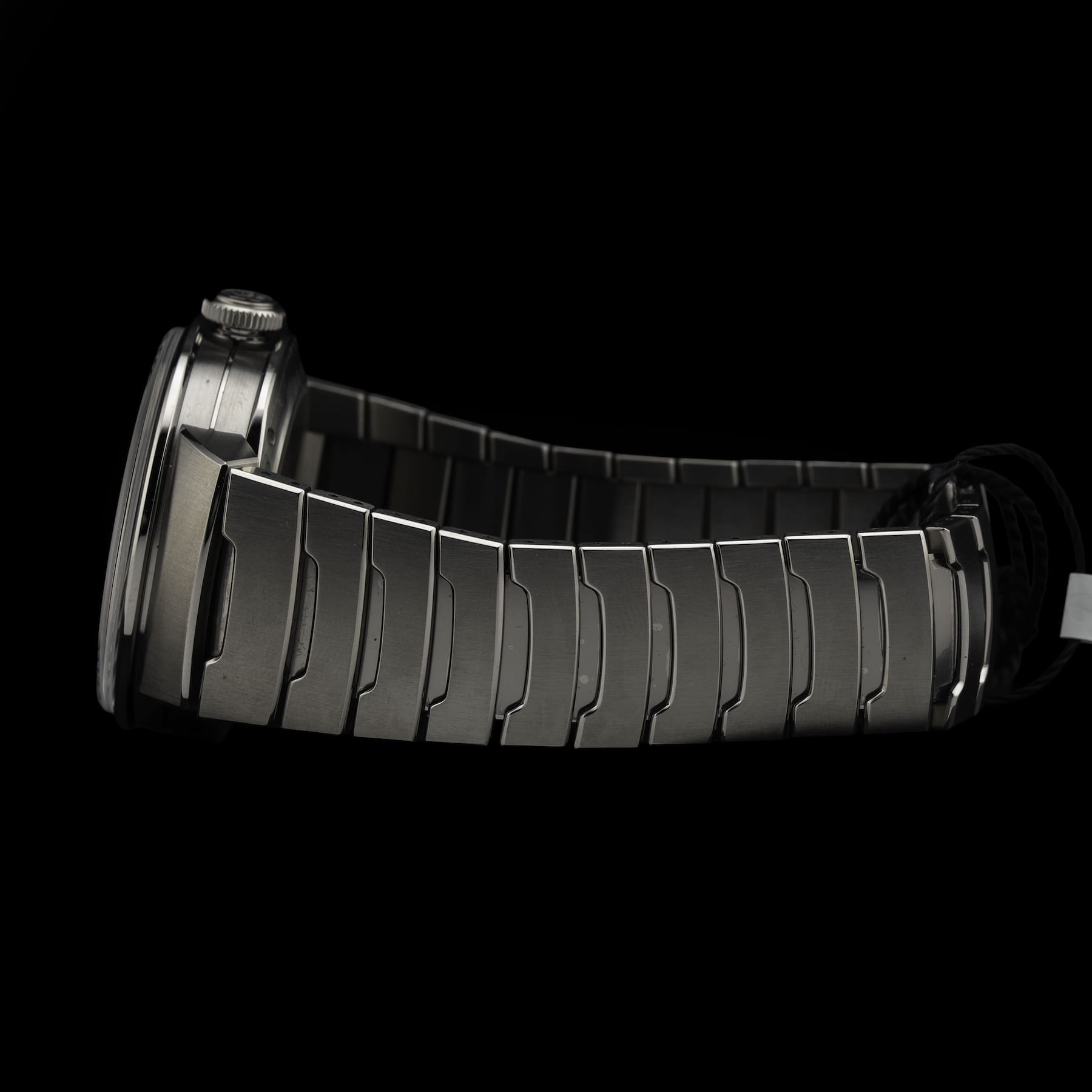 - This timepiece features a 40mm titanium case paired with a high quality titanium bracelet. It showcases a distinctive rhodium dial and is powered by a precise automatic winding movement. The watch is designed with a water resistance of up to 50m.