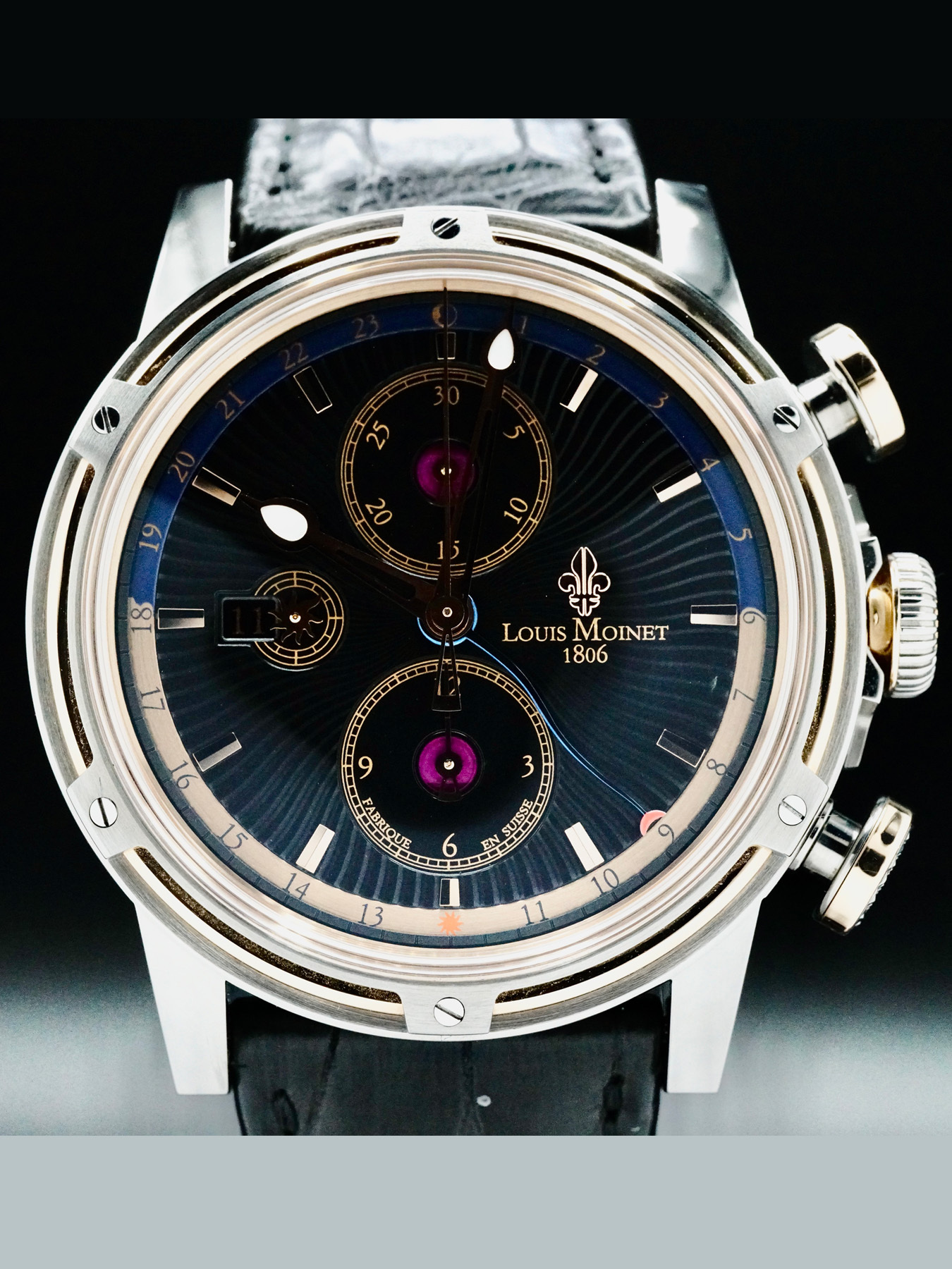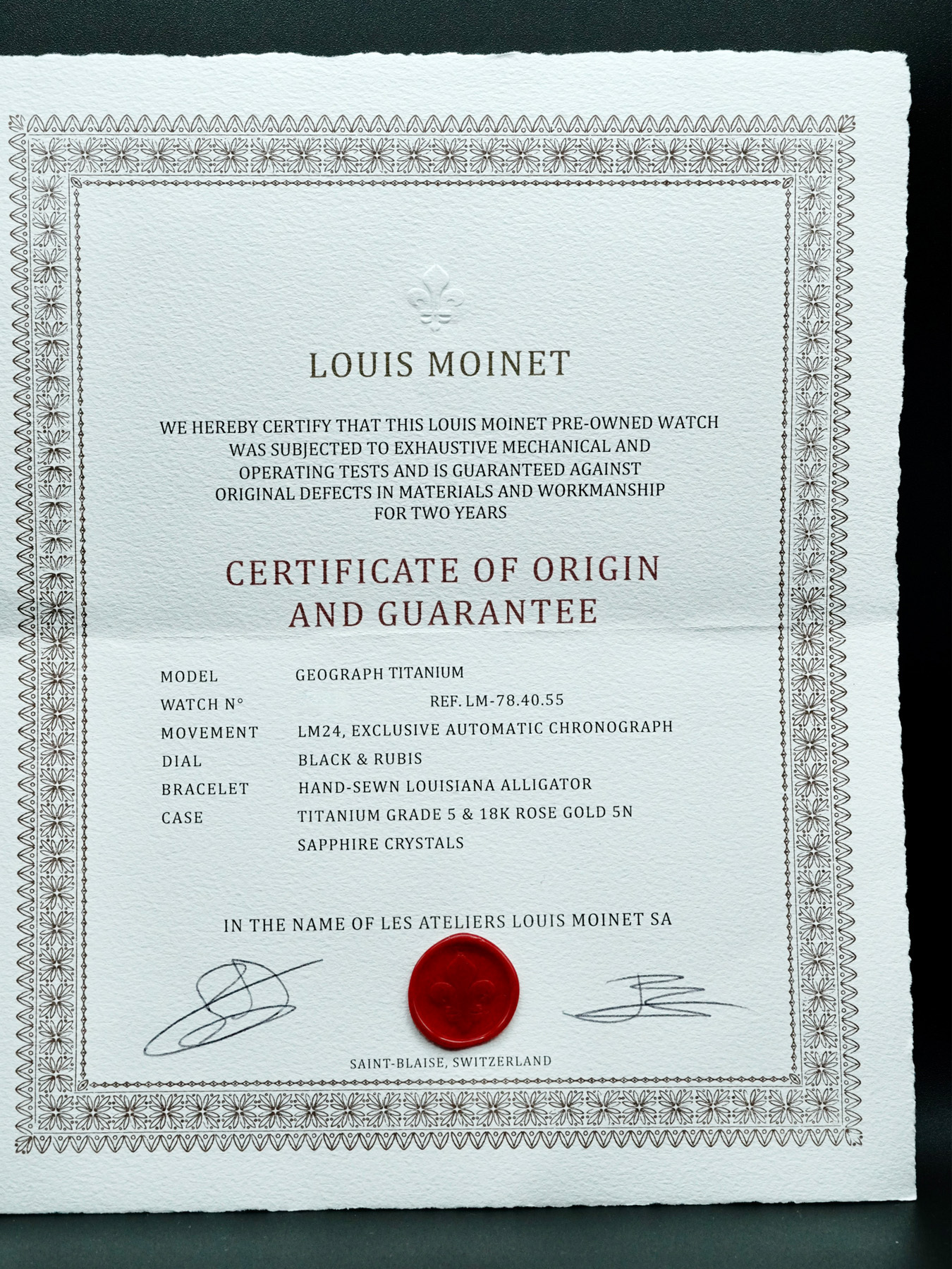 This Louis Moinet LM.78.40.55 Geograph Limited Edition is in EXCELLENT condition. This watch includes original box, instructions booklet and certificate of authenticity. This watch has been fully authenticated and certified by Exquisite Timepieces.