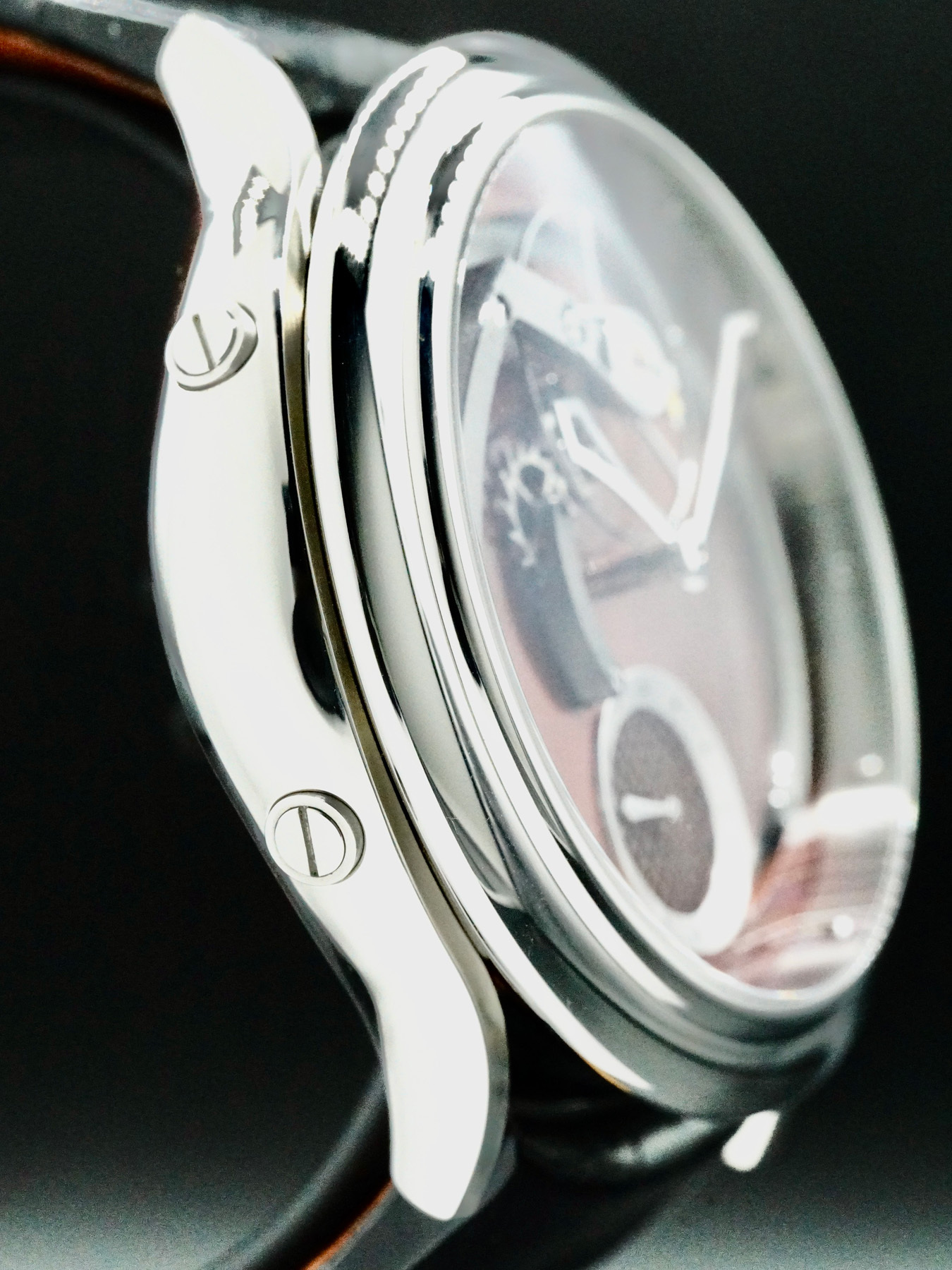 This Manufacture Royale 1770 Voltige features a 45mm stainless steel case with a display case back on a black leather strap. This watch also sports a red dial with silvered hands covered by scratch resistant sapphire crystal.