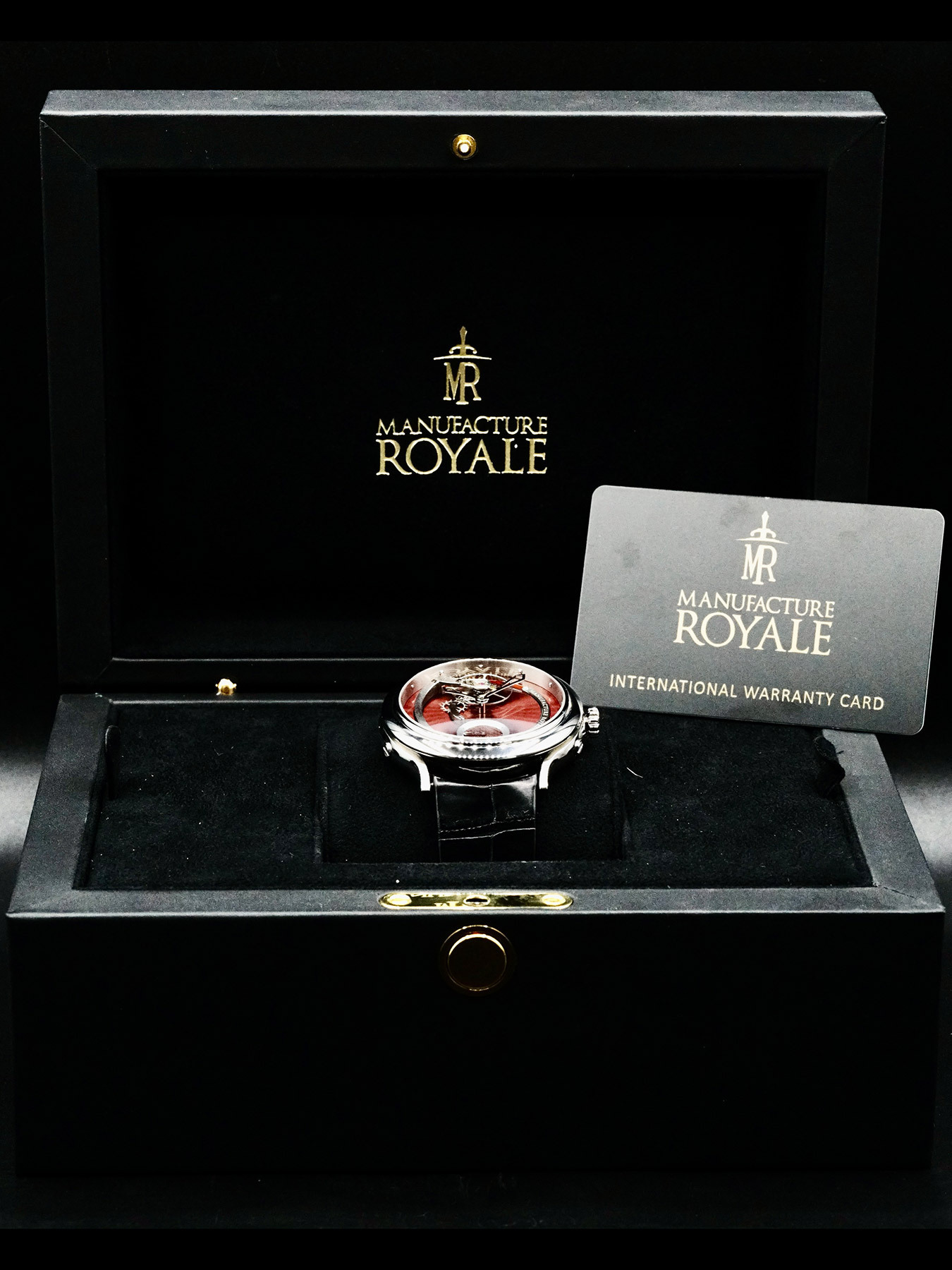 This Manufacture Royale 1770 Voltige Red Dial is in EXCELLENT condition. This watch includes its original box and international warranty card. No date on warranty card.
