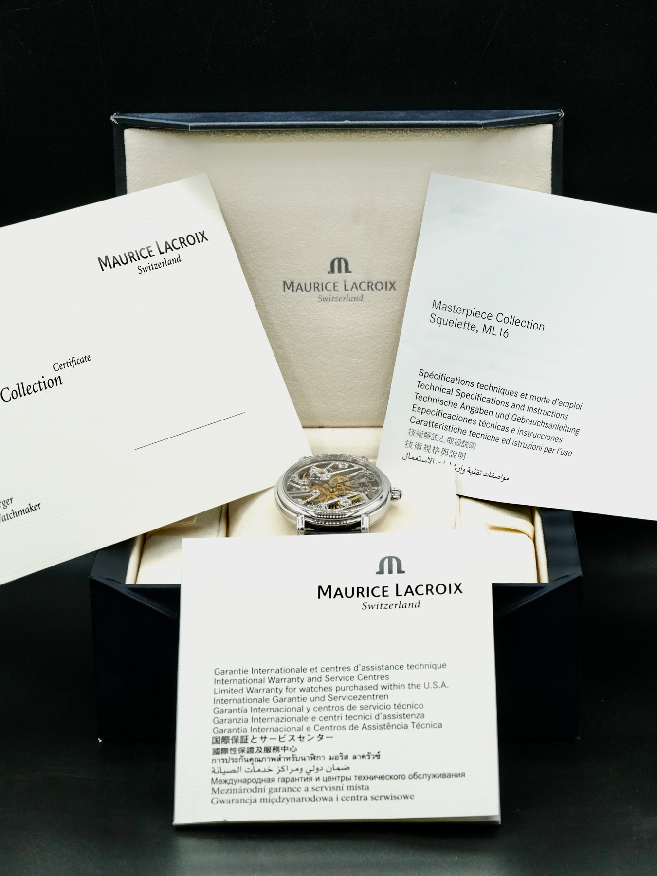 This Maurice Lacroix 16807-1101 Masterpiece Initial Skeleton Limited is in GREAT condition. It has box, certificate, instructions, warranty manual not dated.