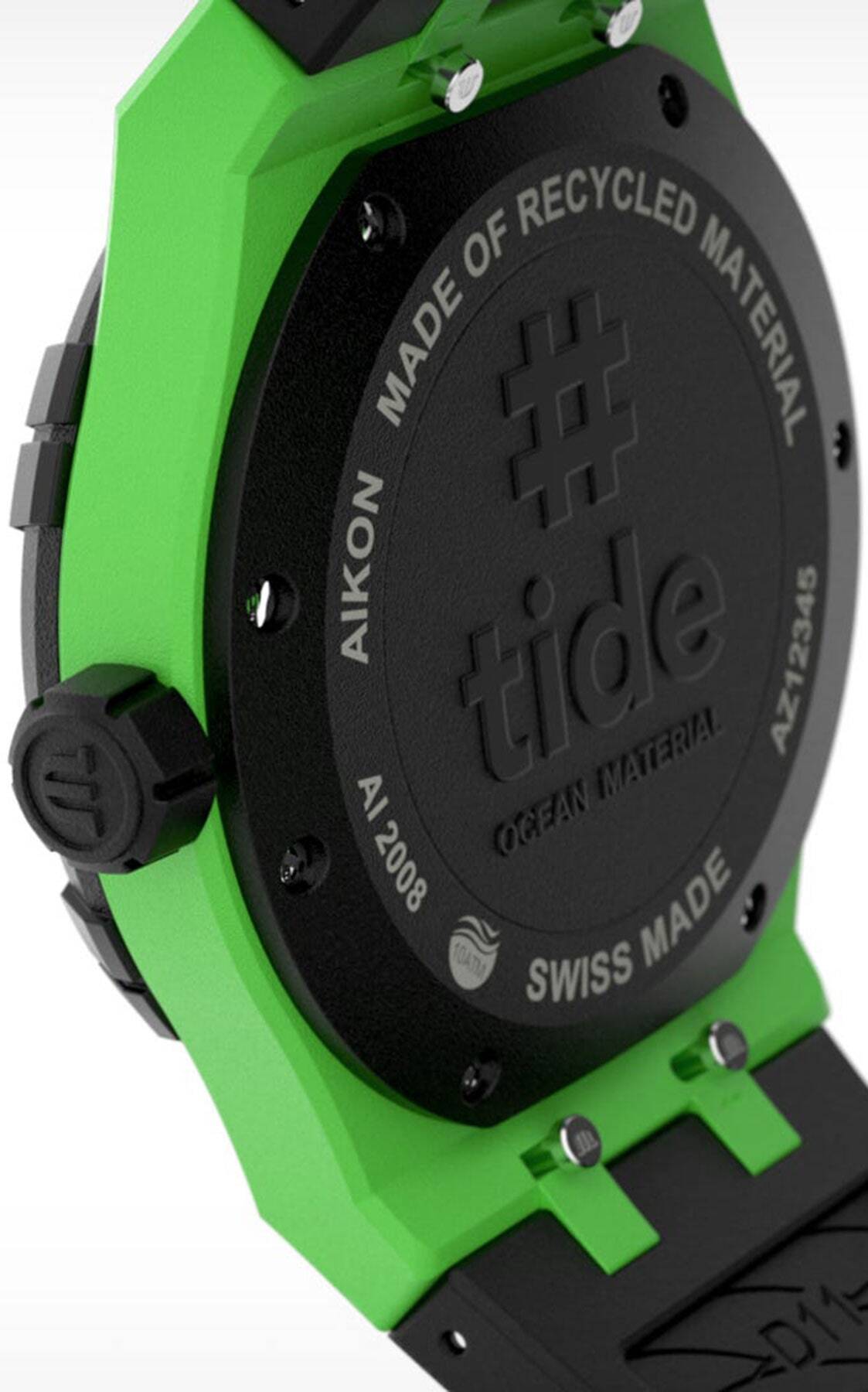The AIKON #tide shares the same attributes as other members of AIKON family, but is formed of #tide ocean-bound upcycled plastic combined with glass fibre. The resultant composite material is twice as hard as standard plastic, five times more resistant and has a carbon footprint that is six times less than PET. The bezel, case, case back, crown, end-piece and buckle on this new model are all made from this composite material. It takes 17 bottles to make one fabulous watch and its tailor made packaging, 100% made of #tide material. It’s a win-win deal.