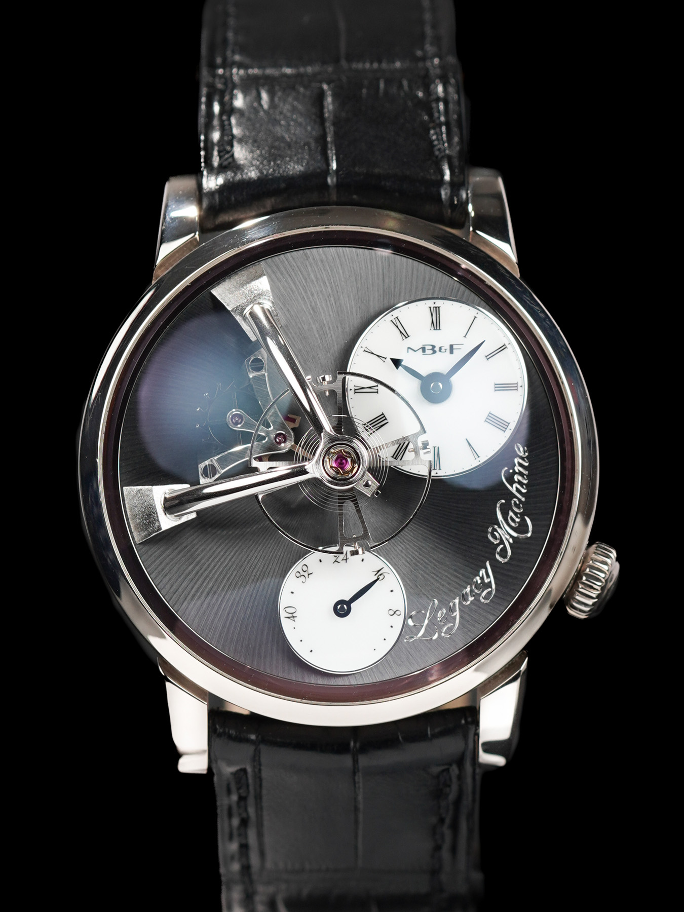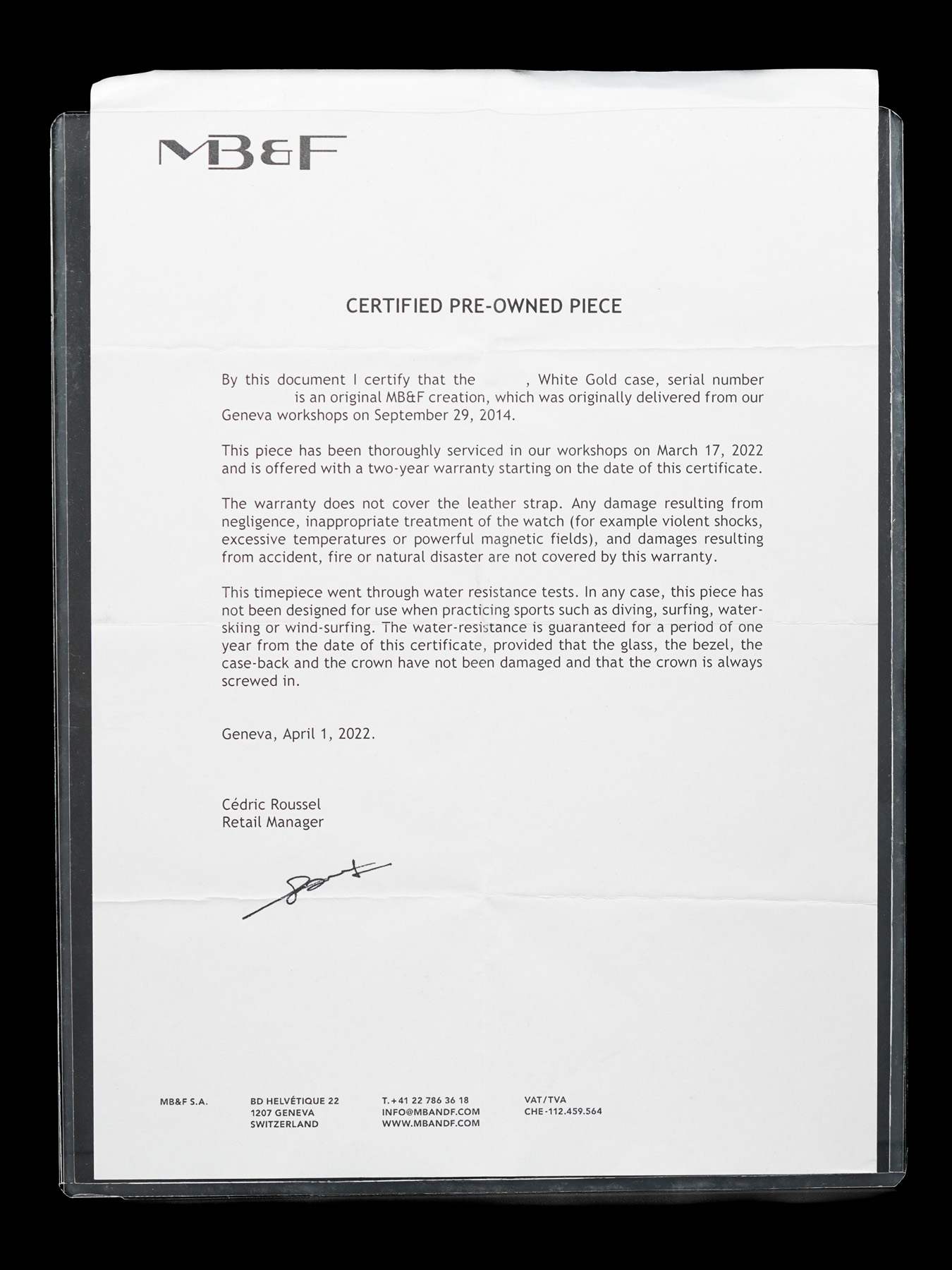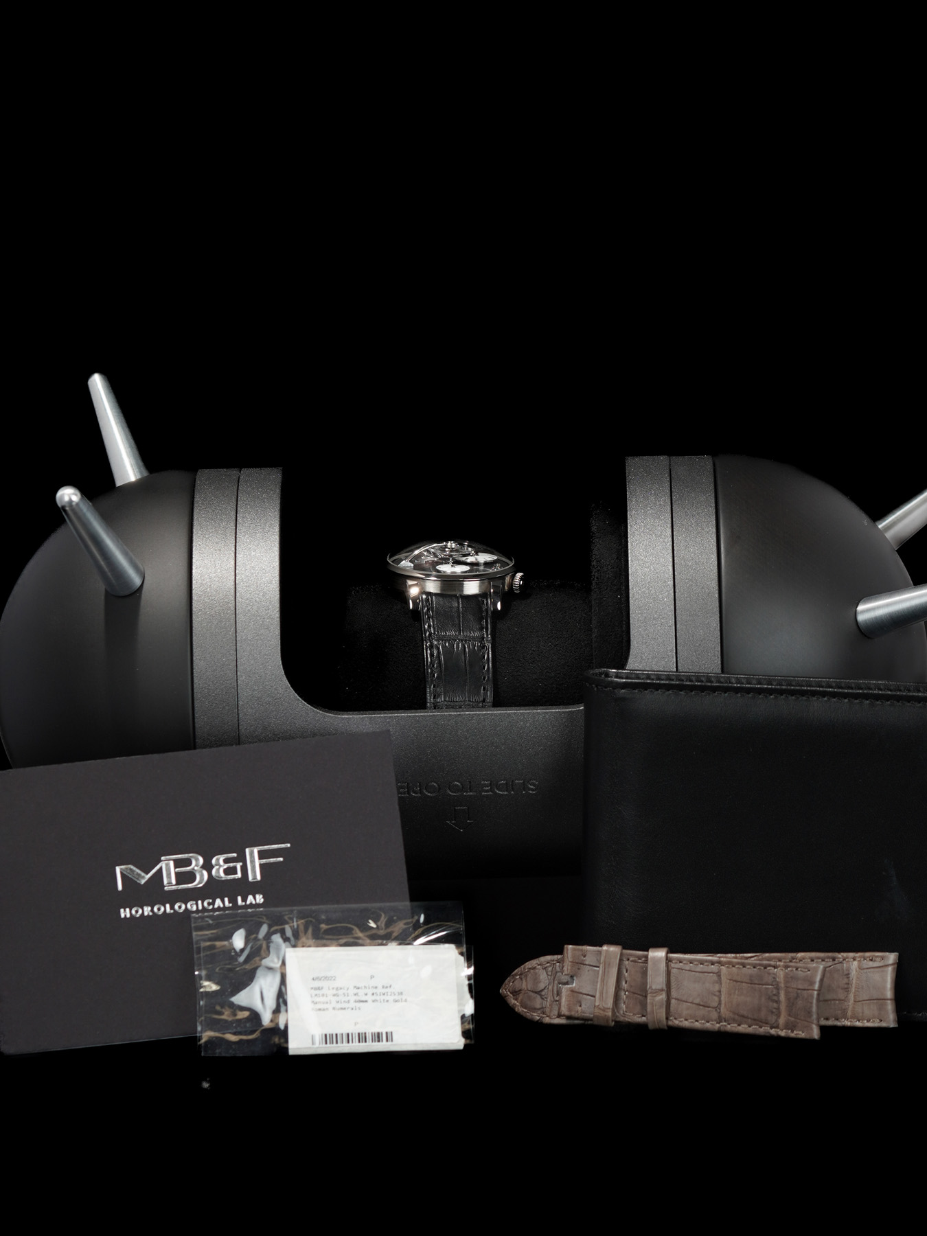 This MB&F 51.WL.W White Gold is in GREAT condition. This watch includes its Original Box, Original Papers, and 2 year warranty dated for March 17th, 2022. Extra leather strap. This watch has been fully authenticated and certified by Exquisite Timepieces.