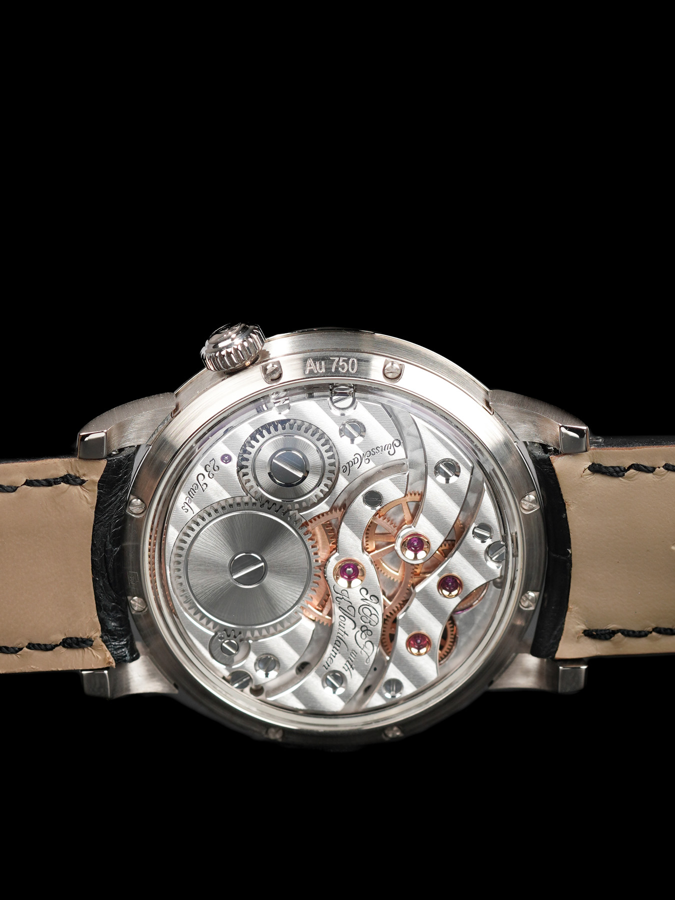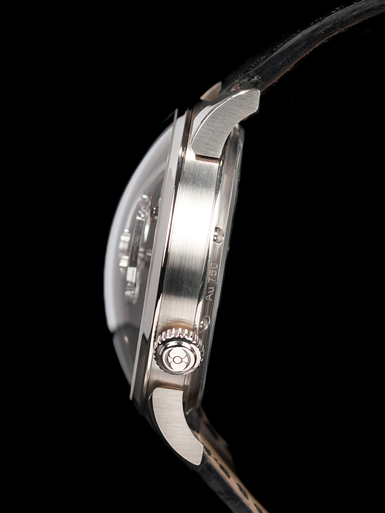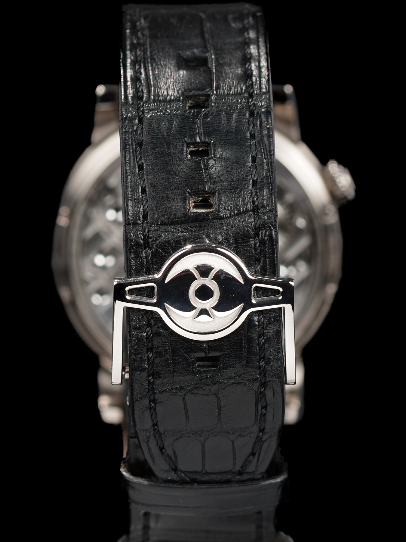 This watch features a 40mm 18K white gold case on leather strap. This watch also sports a black dial. Powered by a manual winding movement.