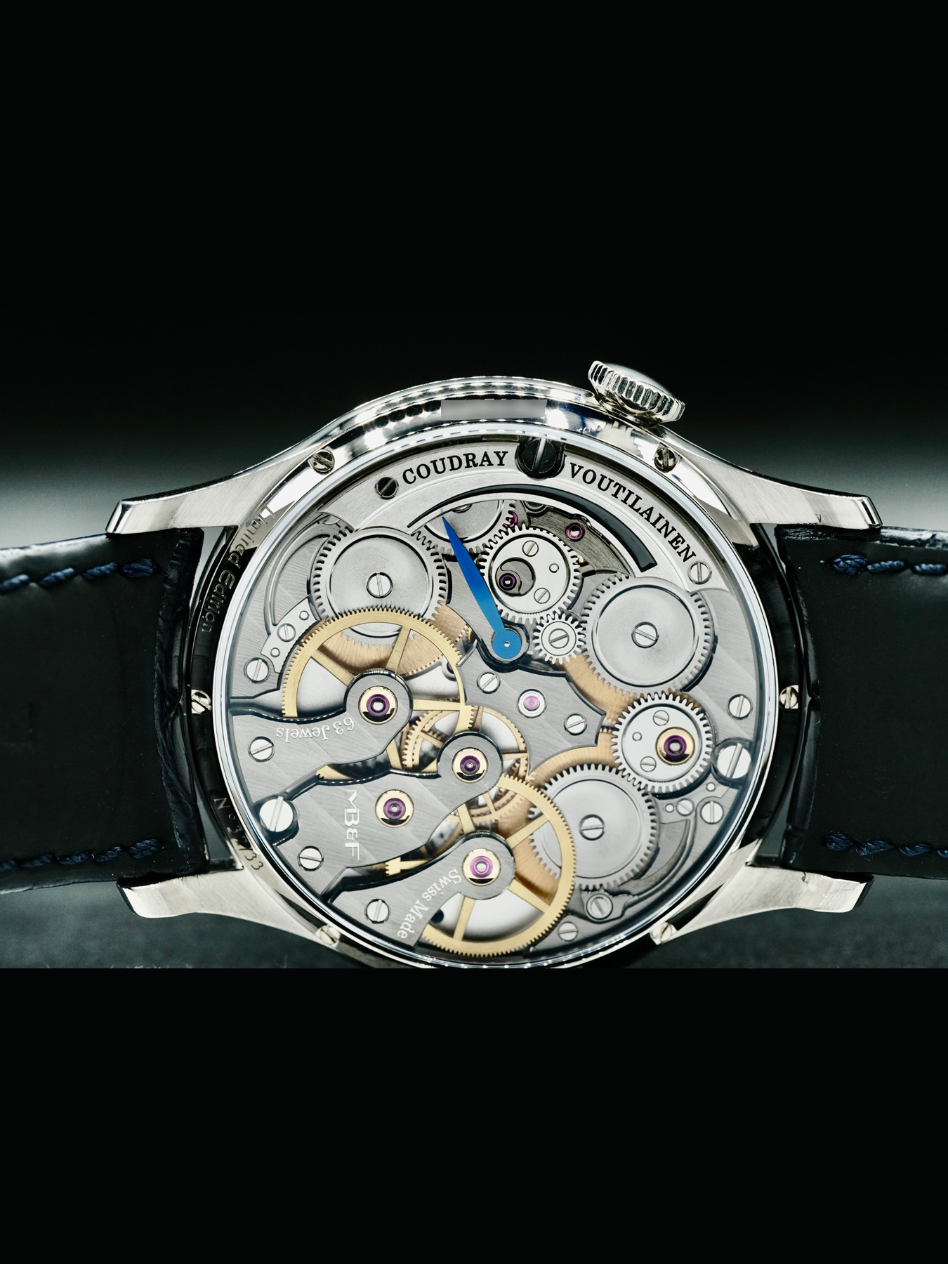This MB&F Legacy Machine Thunderdome features a platinum a 44mm platinum case on leather strap. This watch also sports a light blue guilloché dial.