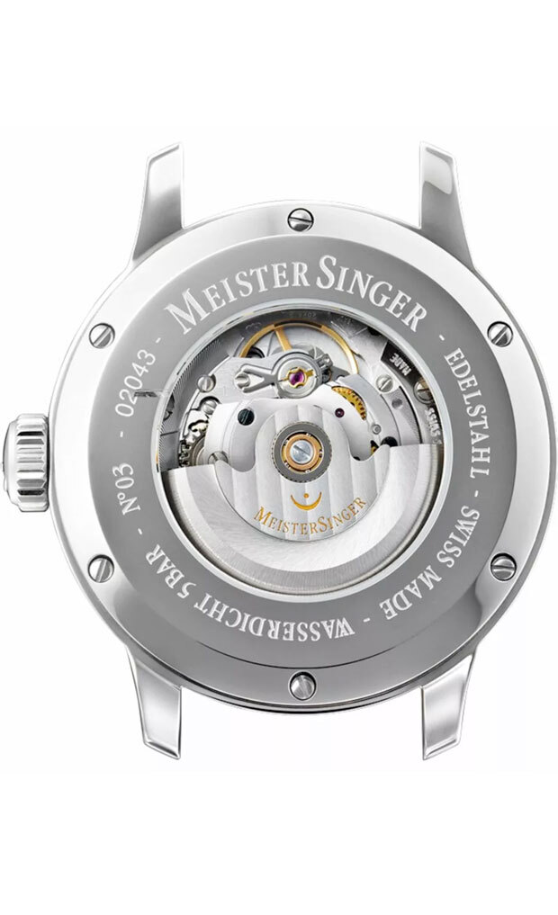 As the sister of the original MeisterSinger №01, the №03 also features all the design details that still characterize the entire collection today: The functional typography with its continuous double-digit hour numerals from 01 to 12, the circumferential line structure, and the fine, needle-shaped hour hand. A watch cannot be designed more clearly, simply, and discreetly than that. In this version, it has a glossy white dial with gold hour markers and blue and black contrasting indices.