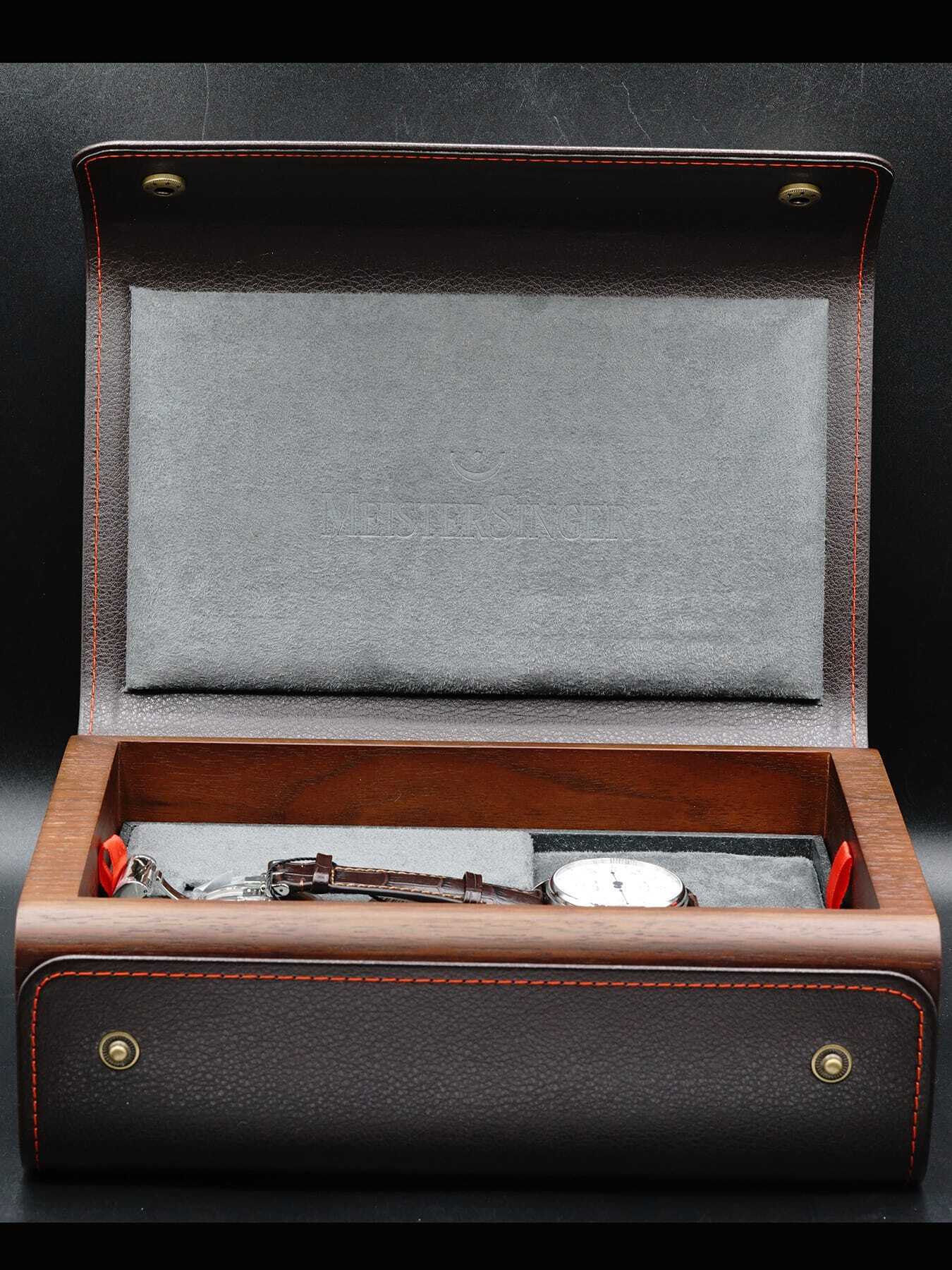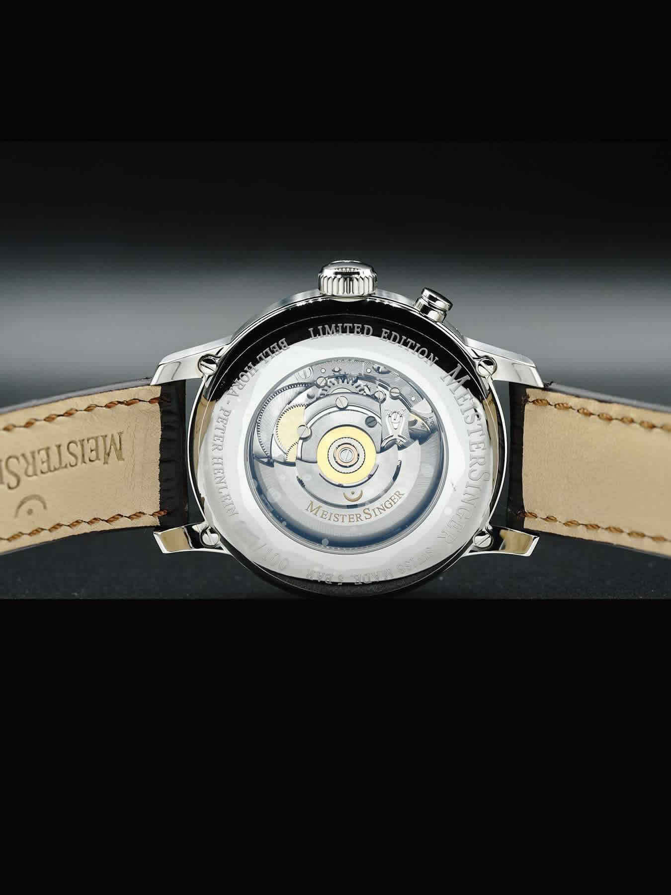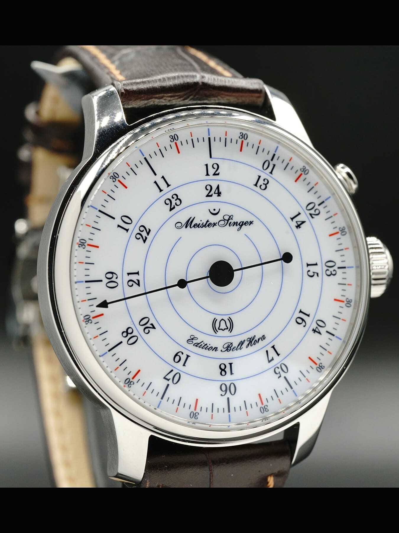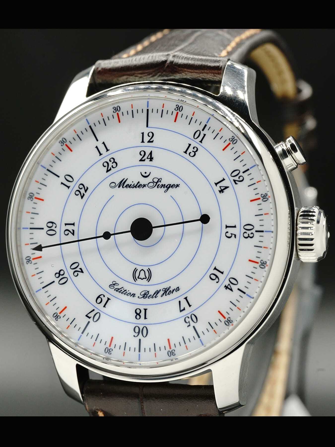 This Meistersinger Bell Hora Anniversary Edition features a 43mm stainless steel case on a brown alligator leather strap. This watch also showcases a white dial covered by scratch-resistant domed sapphire crystal.