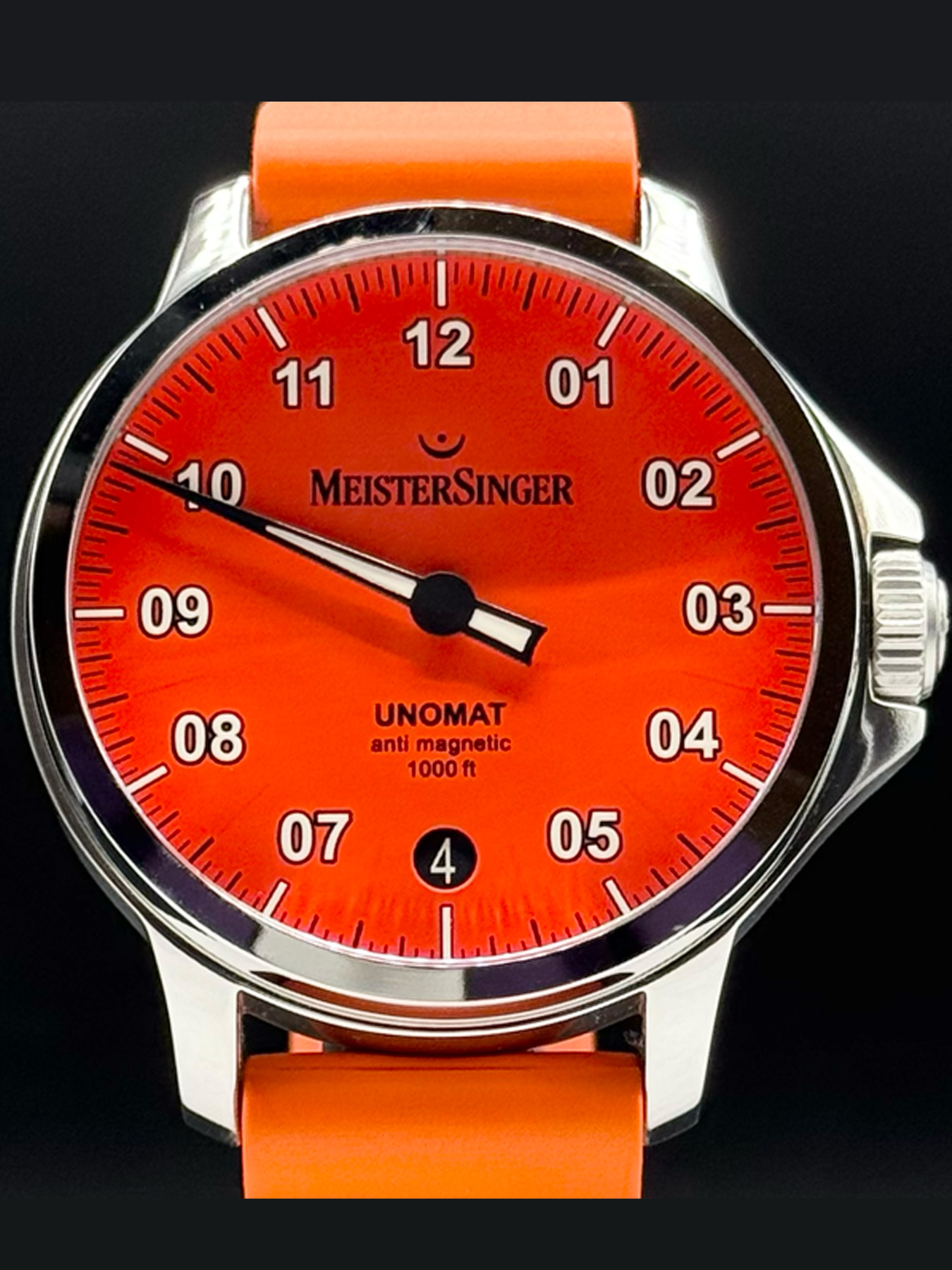 This MeisterSinger ED-UN915 Unomat Orange is in GOOD condition. This watch includes its Original Box and Warranty 1/3/24. This watch has been fully authenticated and certified by Exquisite Timepieces.