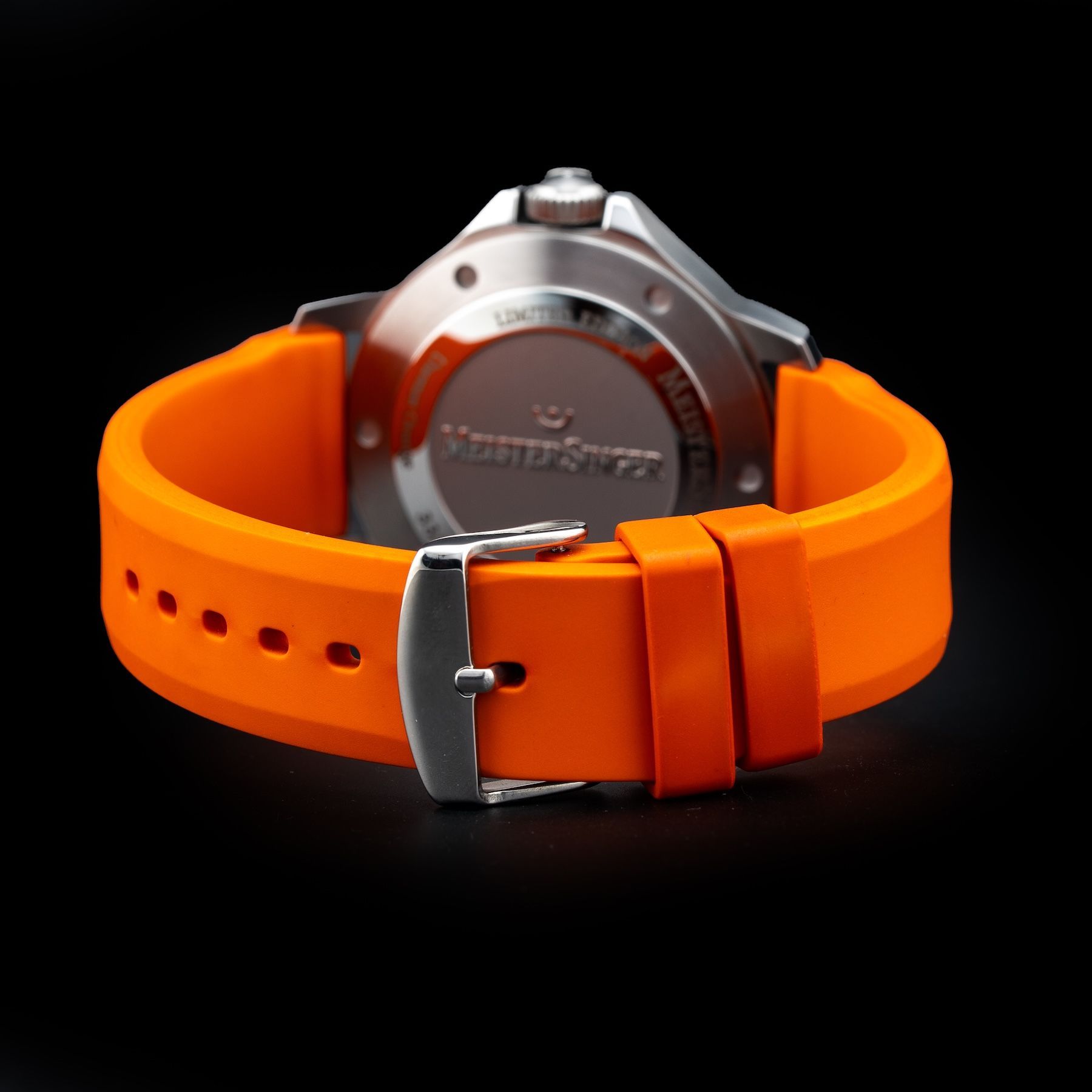- This timepiece features a 43mm steel case paired with a high quality rubber strap. It showcases a distinctive orange dial and is powered by a precise automatic winding movement. The watch is designed with a water resistance of up to 300m.