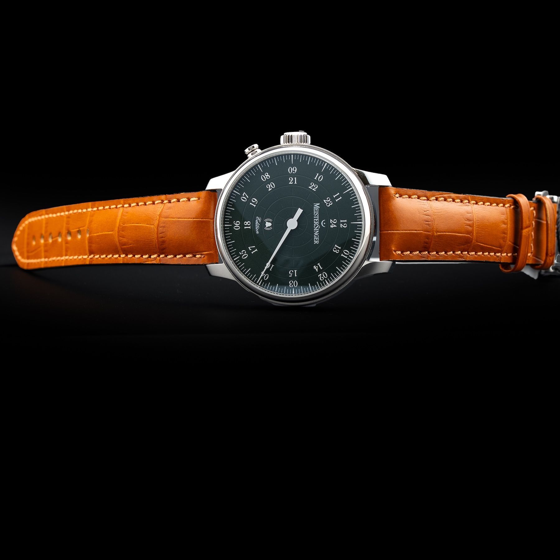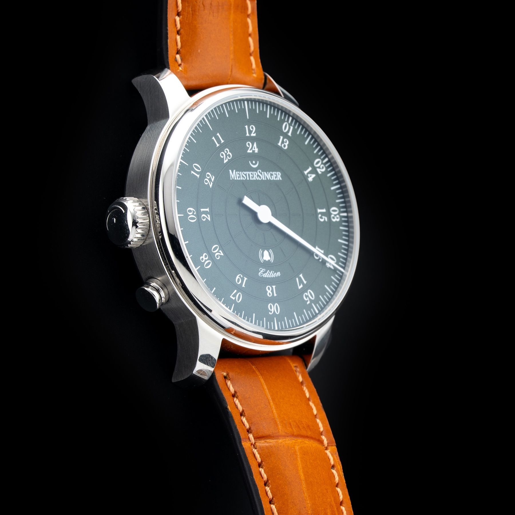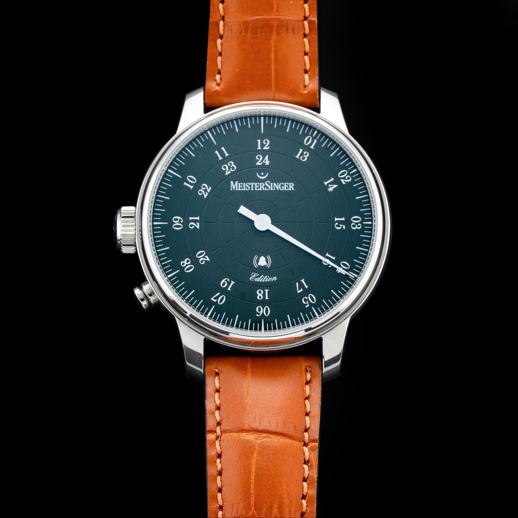 This Meistersinger ED-USA22 Bell Hora Petrol Dial Left Handed is in GREAT condition, it has boxes, papers and warranty card dated 02/27/2025. This watch has been fully authenticated and certified by Exquisite Timepieces.Please note, the photos shown are of the actual watch you will receive.