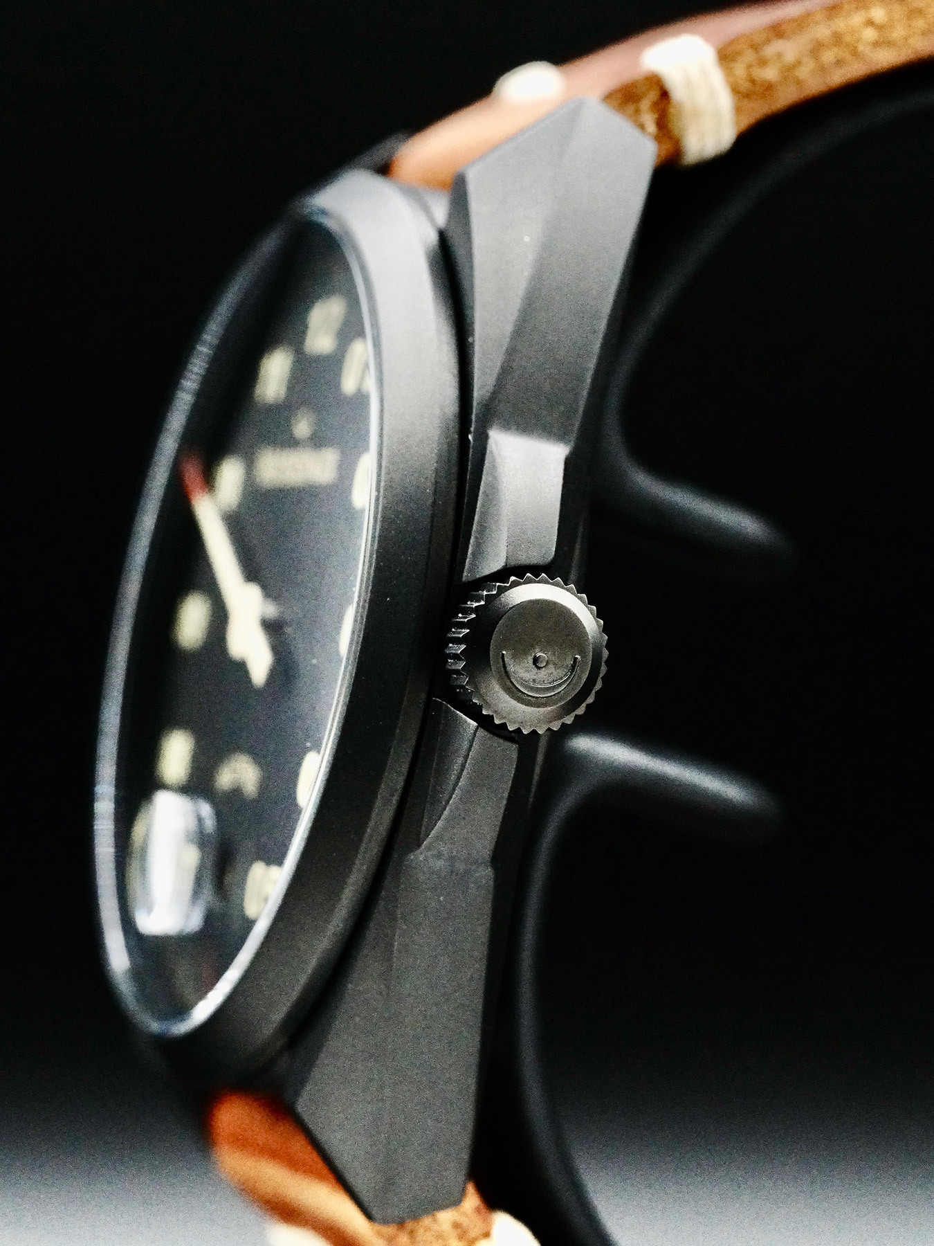 This MeisterSinger Metris Black Line features a 38mm stainless steel with black DLC coating and a display case back on a brown leather strap. This watch also sports a black dial with a single hand and Arabic numeral dial markers covered by scratch resistant sapphire crystal.