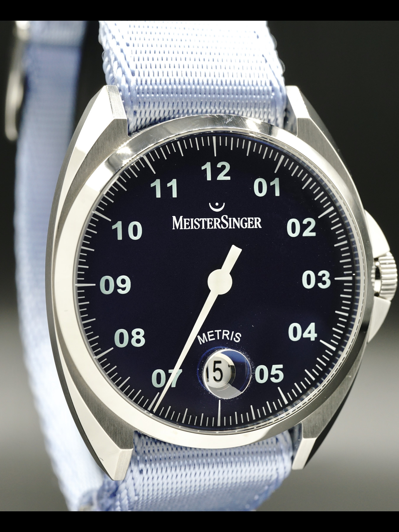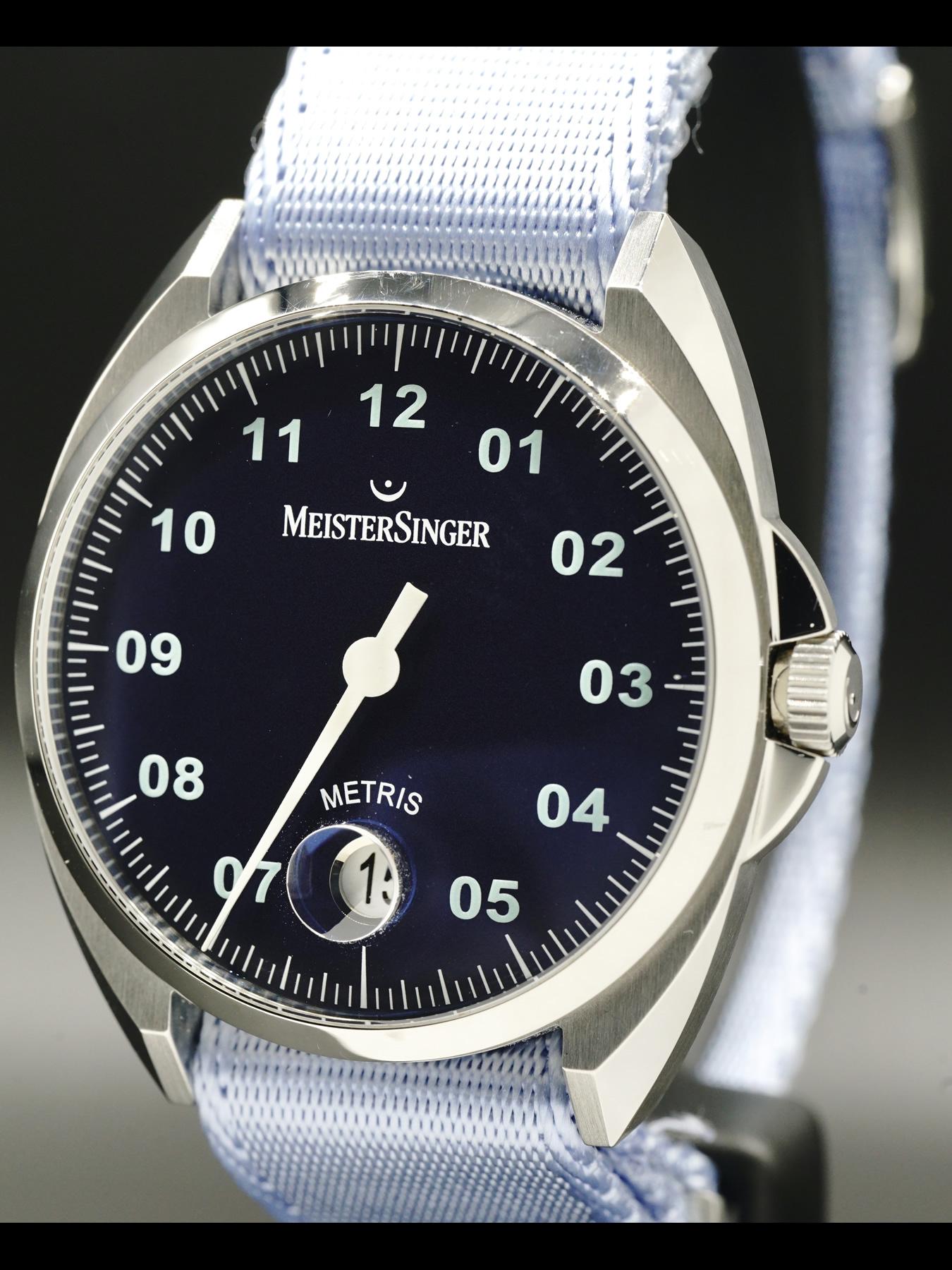 This MeisterSinger Metris features a 38mm stainless steel case on a blue textile strap. This watch also showcases a blue dial with a single hand covered by scratch-resistant sapphire crystal.