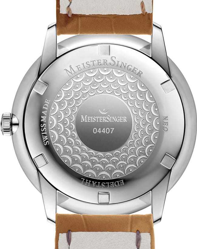 After meticulous redesigning, the Neo looks more modern now than ever. The Baskerville type previously used for the hour markers has been replaced by the sans serif Helvetica the epitome of clear, factual messages since the 60s. The typography of the logo has also been redesigned and is now based on the more recent Meta Serif. The Neo now somewhat reminds us of the No. 01, MeisterSinger's very first single-hand watch, and its instrument-like character. The Neo's new, round date window, taking up the shape of the case and drawing attention to itself with the date display's contrasting color, is also in keeping with this design. The discreet size of the Neo remains unchanged. Thanks to its thin plastic glass, the Neo is only 9.7 millimeters high. The neat relief of its steel screw-in back shines just like the sunburst pattern on the silver-white and blue dials. Two additional versions of the Neo are available with either a black or an ivory lacquered dial respectively.