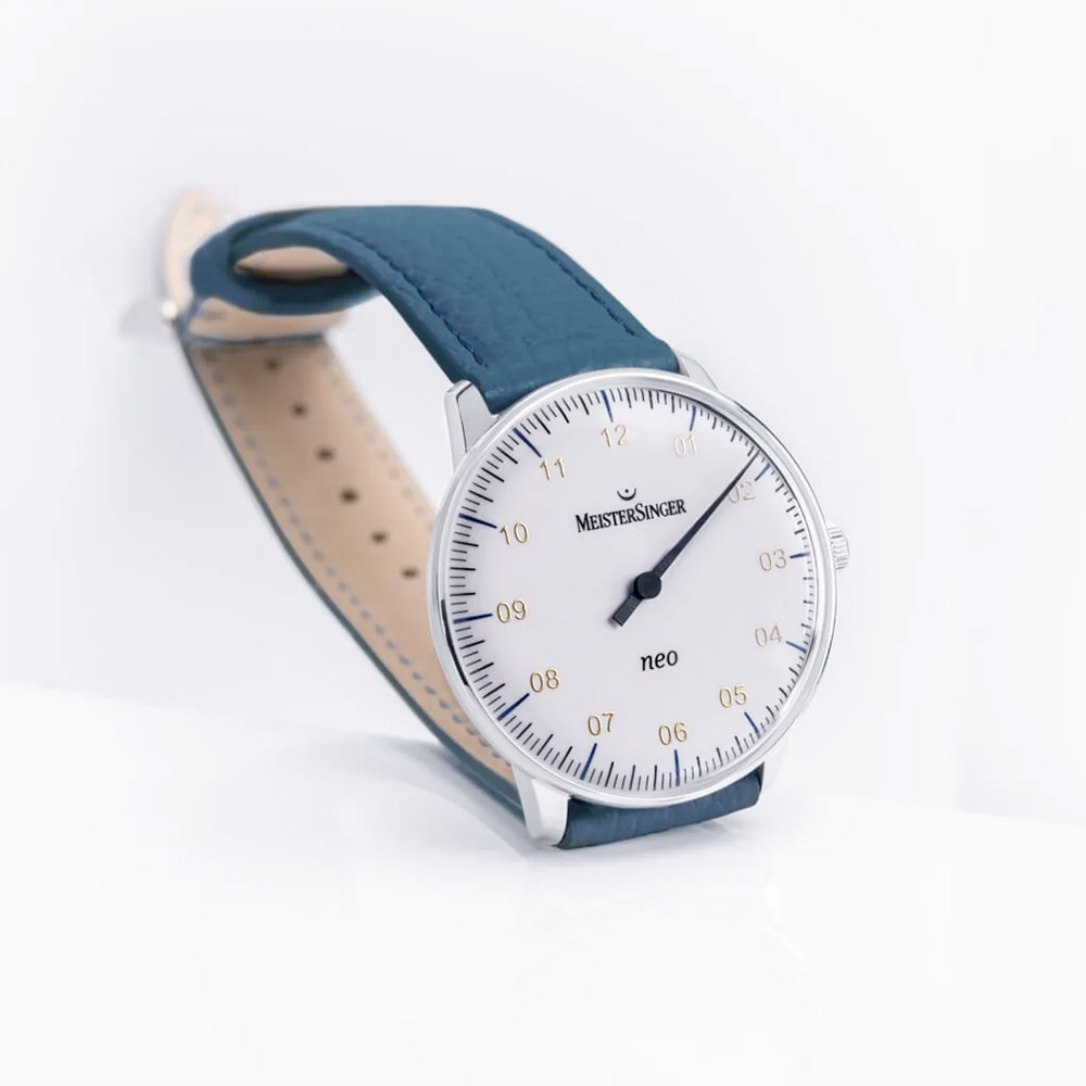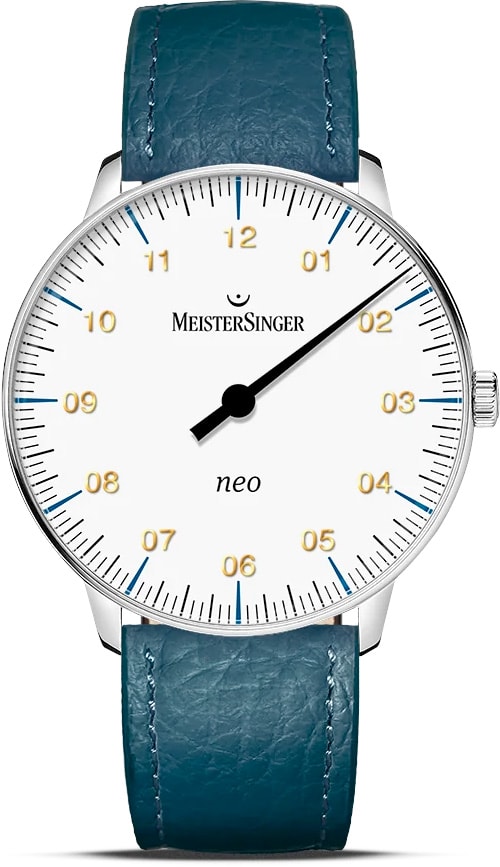 The Neo combines the design of the 60s with the unique characteristics of a MeisterSinger watch. The functional typography with its continuous double-digit hour numerals from 01 to 12, the circumferential five-minute divisions, as well as the single needle-shaped hour hand make this watch a genuine MeisterSinger classic.