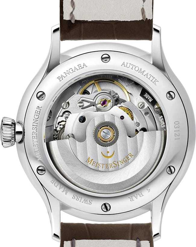 At MeisterSinger we have always focused on the really important moments: the hours and days which stay in our memory. Therefore it is only logical for MeisterSinger to now offer the Pangaea Day Date with a day and date function. The date and day of the week can easily be read next to the twelve without losing sight of the time or the other days.