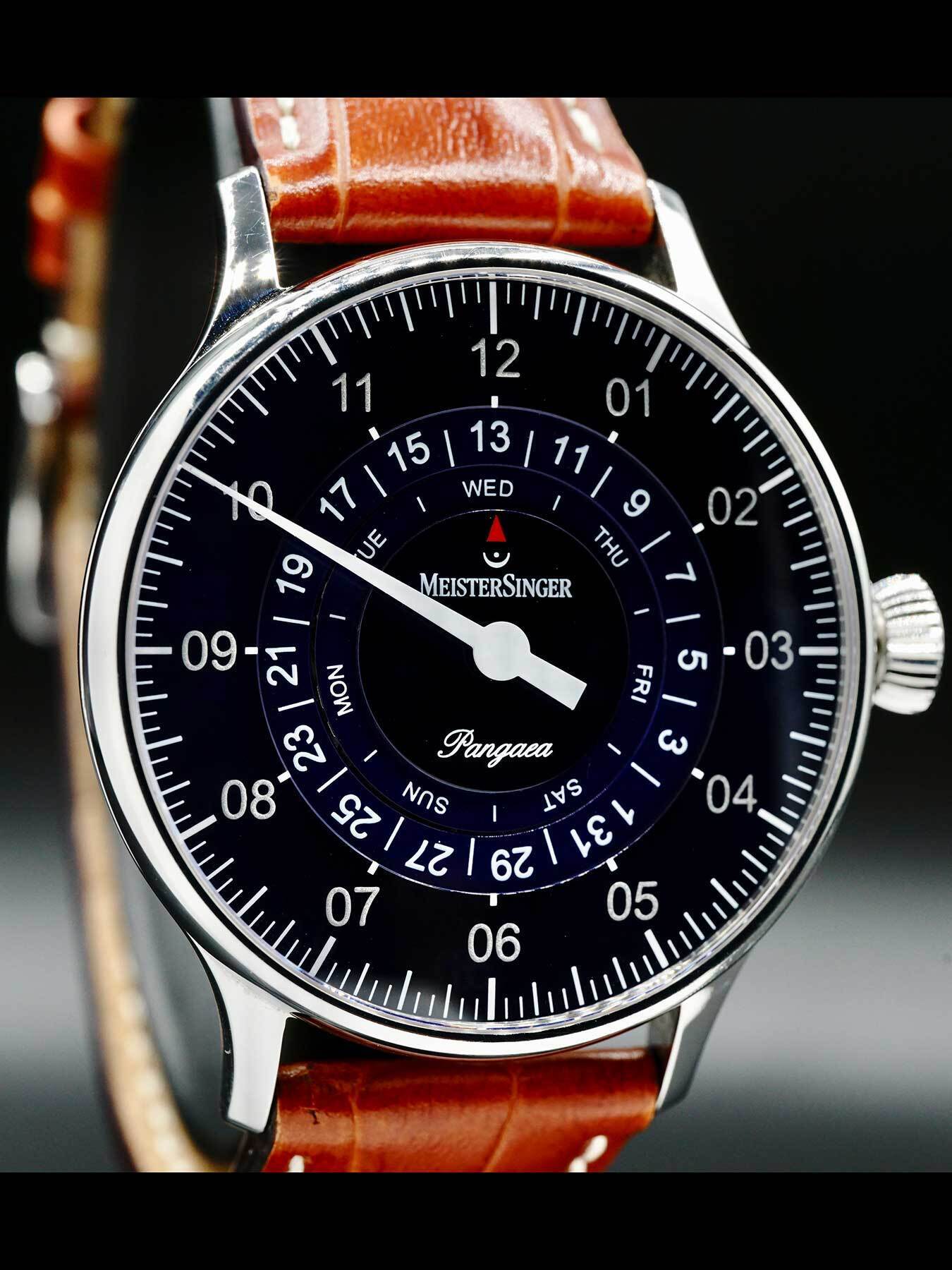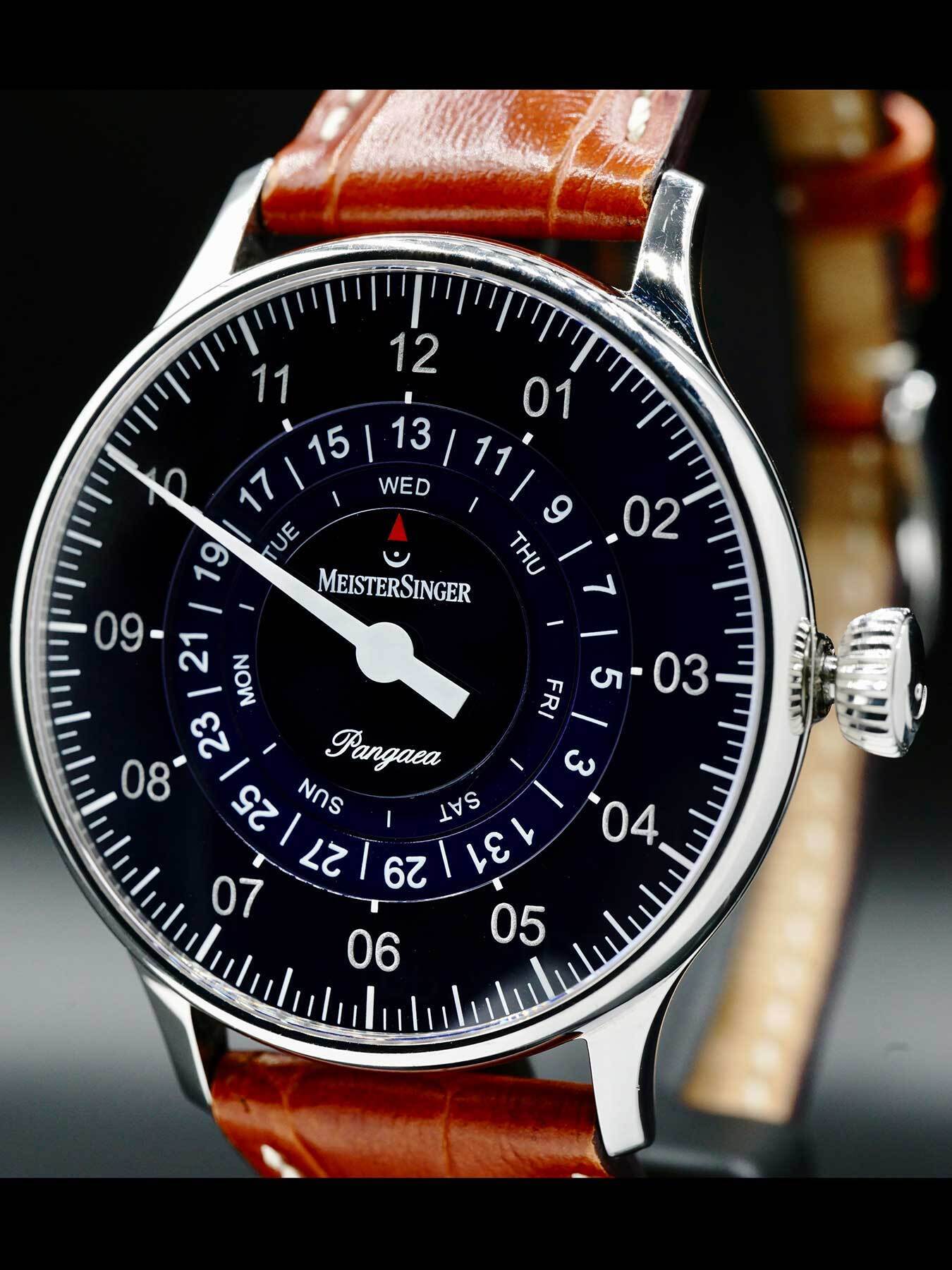 Whether from the front, rear or even from the side. The Pangaea Day Date from MeisterSinger is nice to look at from any angle. Gliding past each other in opposite directions, the open day and date rings are typical elements of the MeisterSinger. And the flat, curved case elegantly disappears under every cuff.