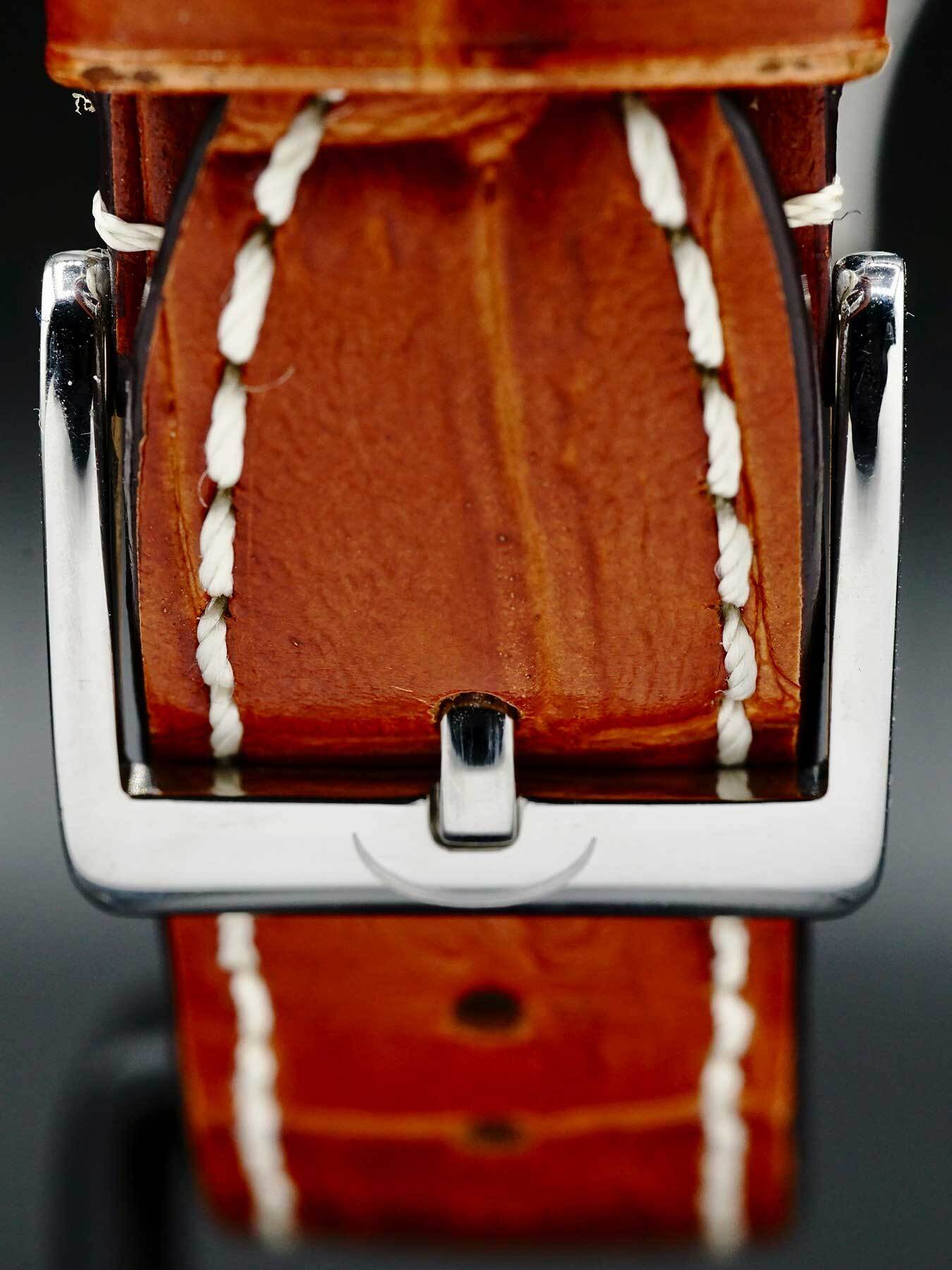 This MeisterSinger Pangaea Day Date features a 40mm stainless steel case with 6-screwed exhibition case back on a brown leather strap. This watch also showcases a sunburst blue dial with a single hand covered by scratch resistant sapphire crystal.