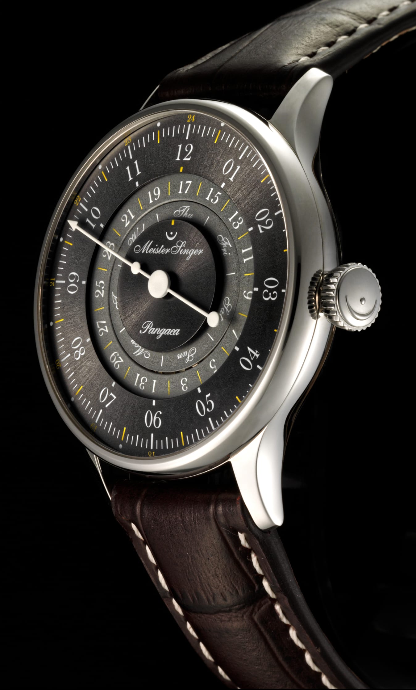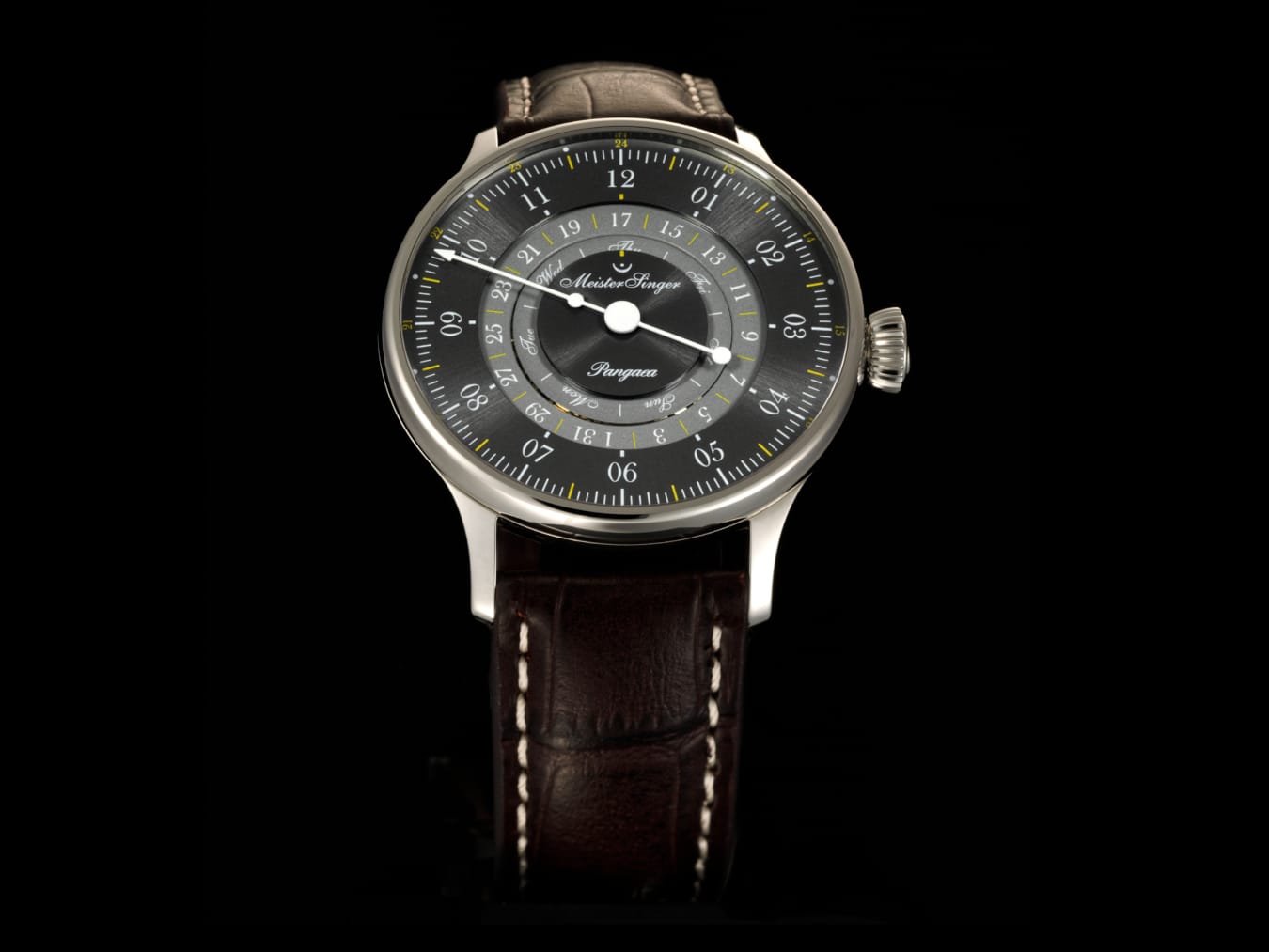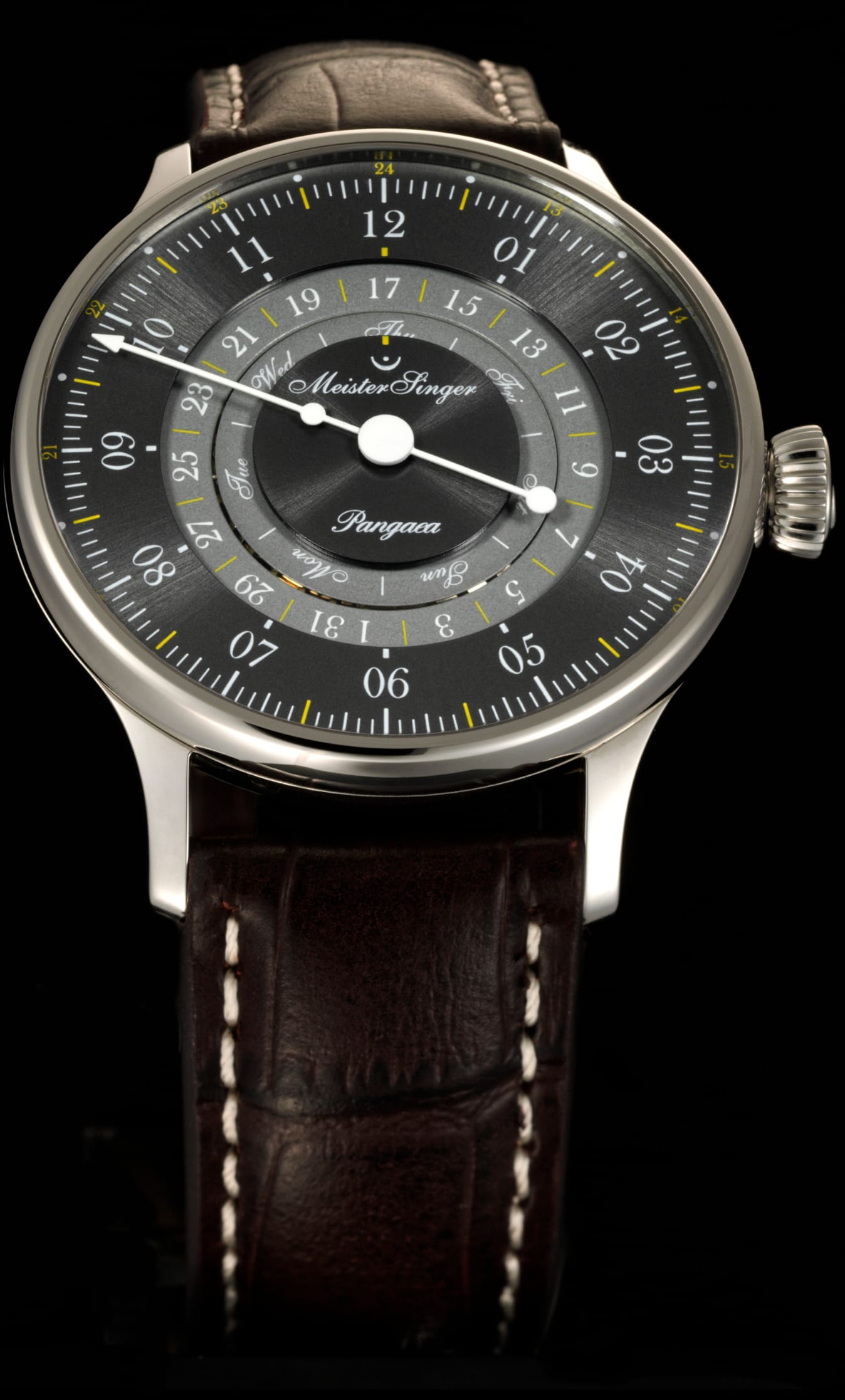 The Pangaea Day Date has been a reliable part of the MeisterSinger collection for more than 10 years. With its unusual day and date display on open rings, it has already won three prestigious design awards, i.e., the Red Dot, the German Design, and the Good Design Award.