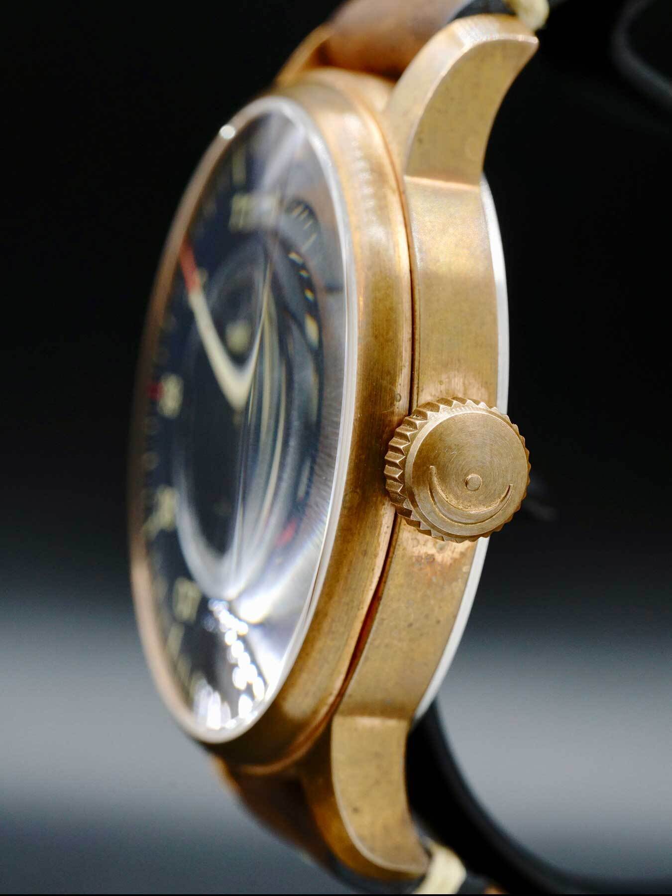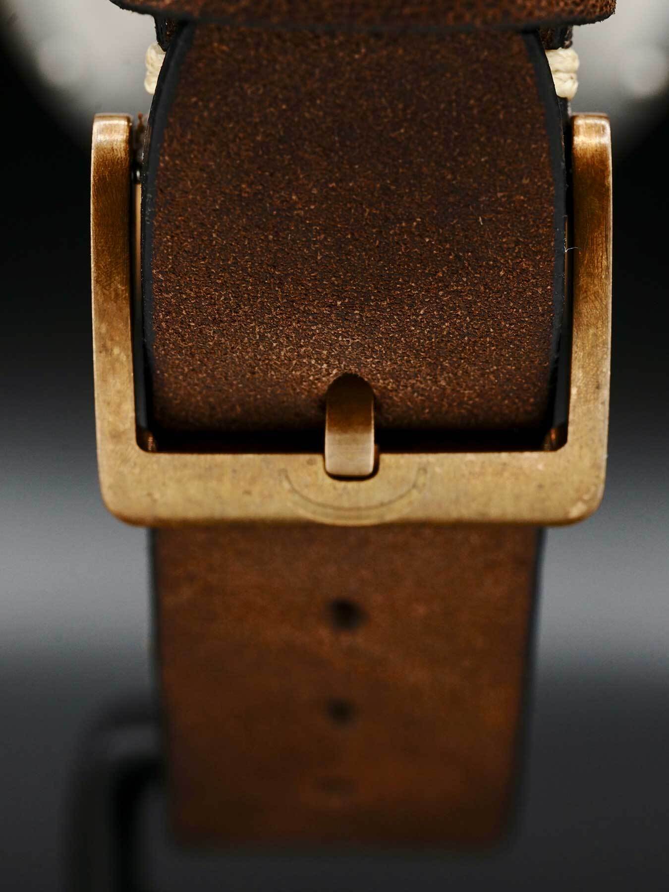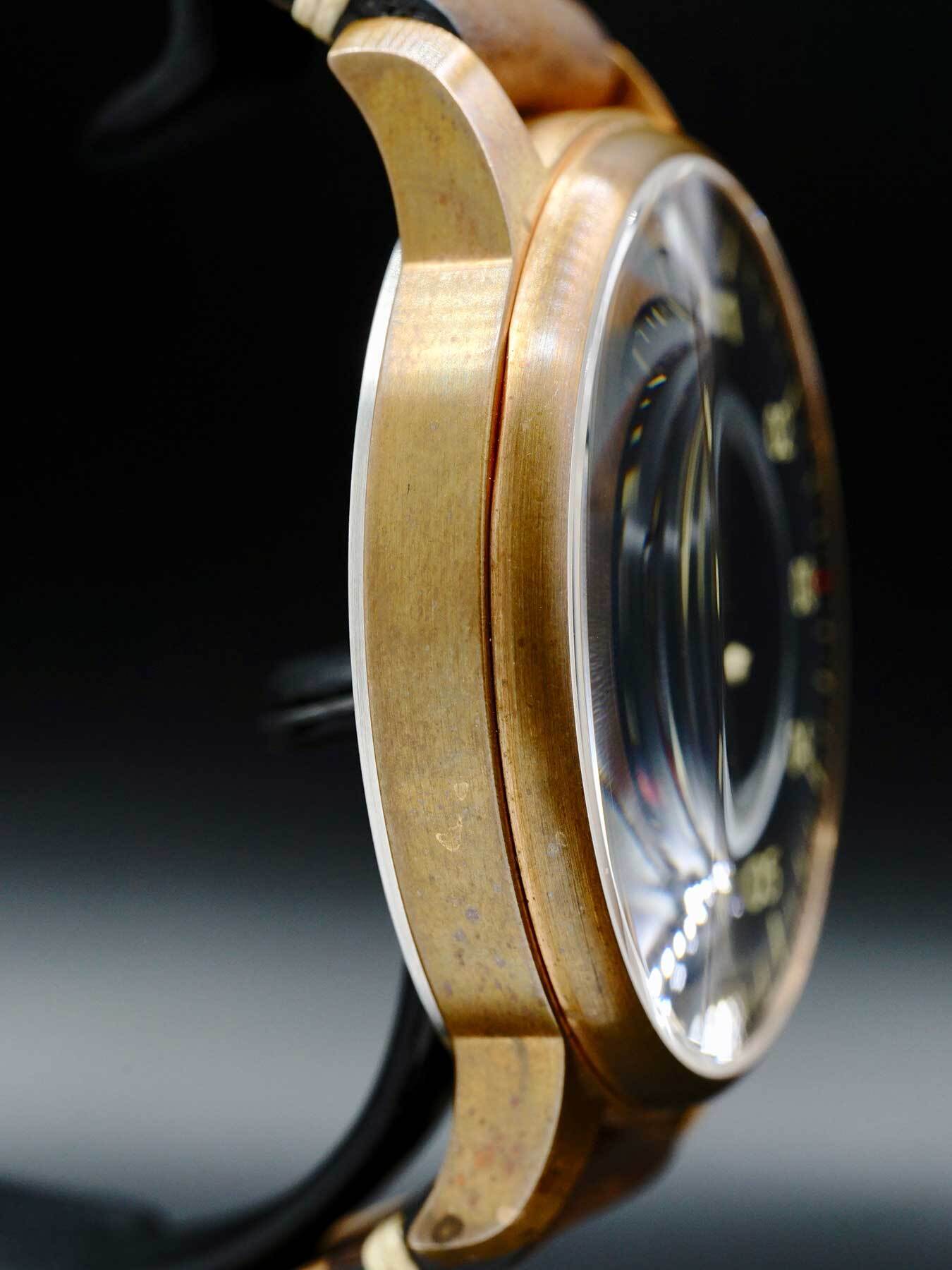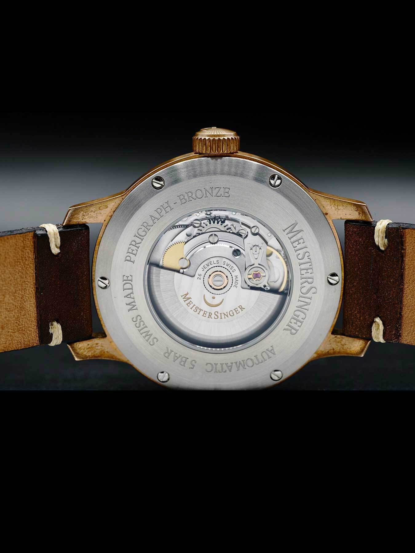 This MeisterSinger Perigraph features a 43mm bronze case and bezel with a partial skeleton case back on a brown leather strap. This watch also showcases a steel blue (old radium) dial with a bronze-tone hand covered by scratch resistant sapphire crystal.