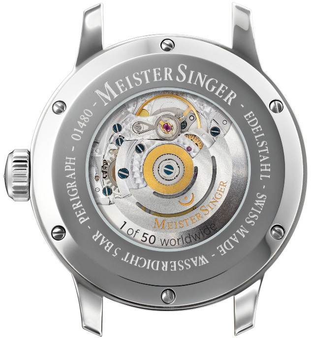 The Perigraph received a Red Dot Design Award and the GOOD Design Award for its overall design concept and was also voted Watch of the Year. Its stainless steel case is 43 millimeters in diameter, water-resistant up to 5 bar, and the dial is covered by a domed sapphire glass. The Swiss automatic movement, with a rotor that supplies the watch with a 38-hour power reserve, can be viewed through the six fold screwed glass exhibition back.