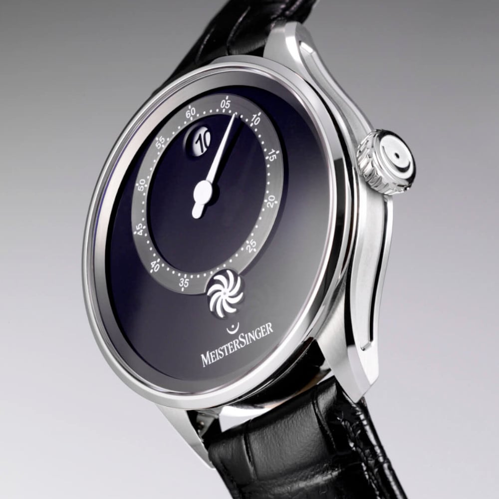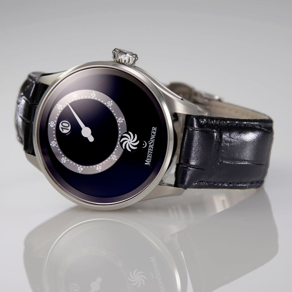 Each line in the outer circle of MeisterSinger’s single-hand watches stands for exactly 5 minutes. The hand is therefore both an hour hand and a minute hand. For example, if the hand points to the fifth stroke after ten, the time is 10:25.