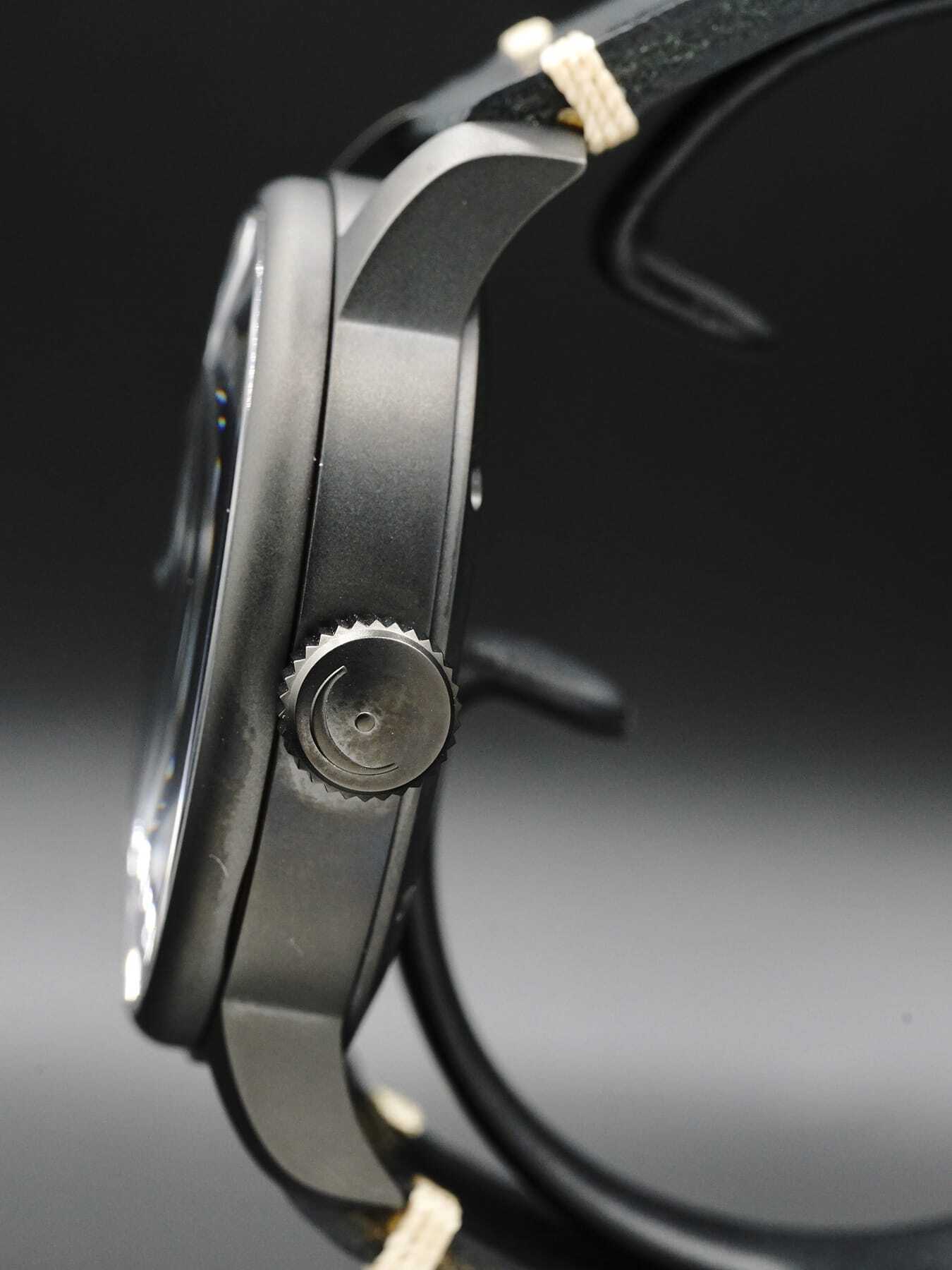 This MeisterSinger Stratoscope Black Limited Edition features a 43mm stainless steel case on a black calfskin leather strap. This watch also showcases a black dial covered by sapphire crystal.