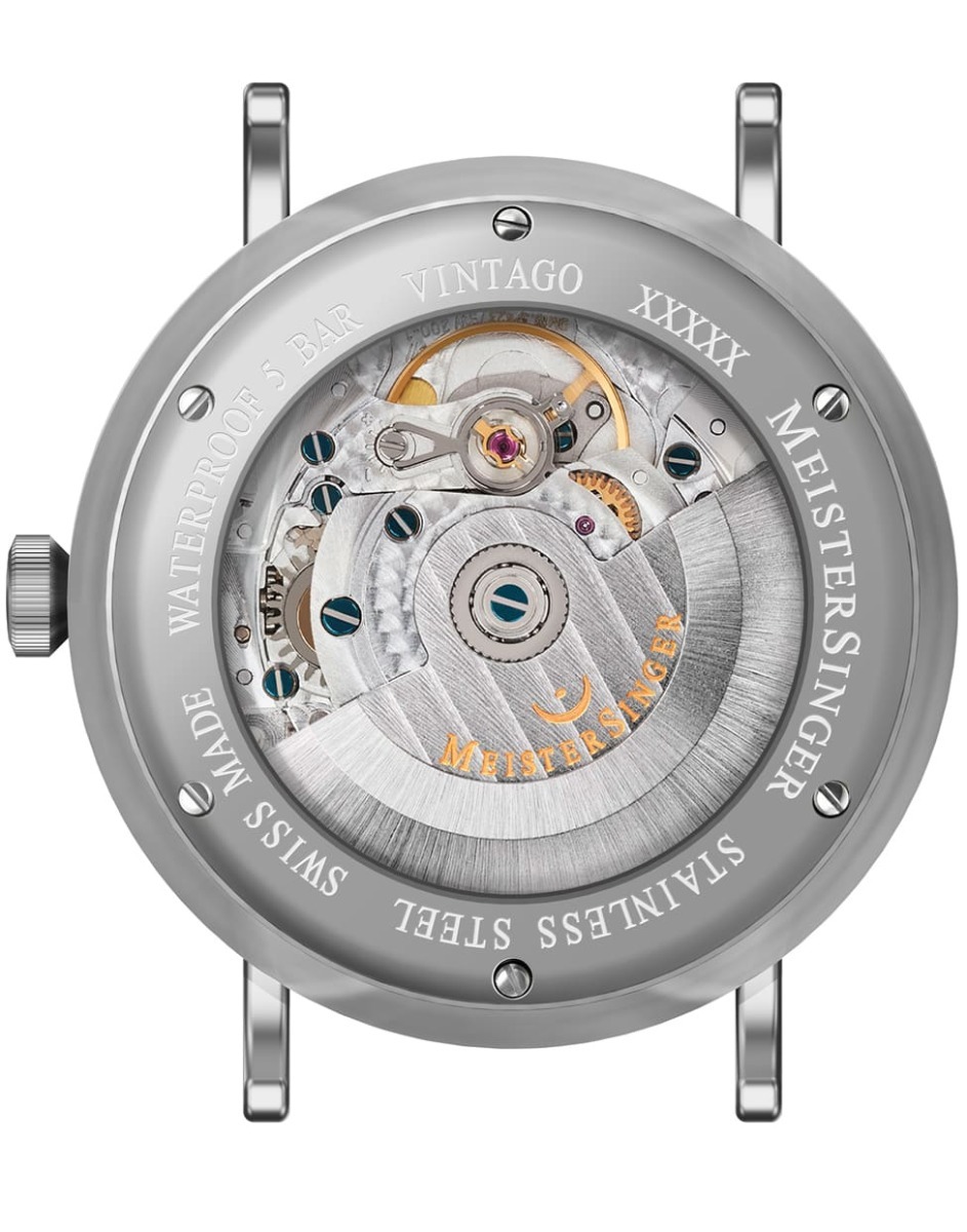MeisterSinger presents the Vintago: Minimalism in design and time display. As the name suggests, the Vintago also provides a look back to the past, because it embodies the design virtues of a rather elegant era. The purely functional typography and the flat glass domed over the unadorned dial are reminiscent of the austere design language of the 1960s. The finely brushed stainless steel case with its discreet 38-millimetre diameter is also typical of that decade. And last but not least, the carefully designed crown also harks back to those bygone years.