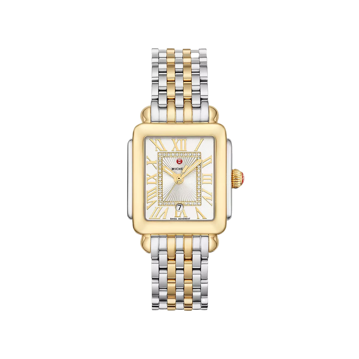 This two-tone 18K Deco Madison Mid shines with 40 hand-set diamonds atop the silver white sunray dial. The two-tone 18K gold bracelet is made specifically for the Deco Madison Mid collection and is interchangeable with any 16mm MICHELE strap.