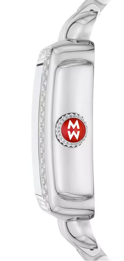 This stainless Deco Madison shines with 108 hand-set diamonds on the bezel and 47 atop the silver and white sunray dial. The stainless bracelet is interchangeable with any 18mm MICHELE strap.