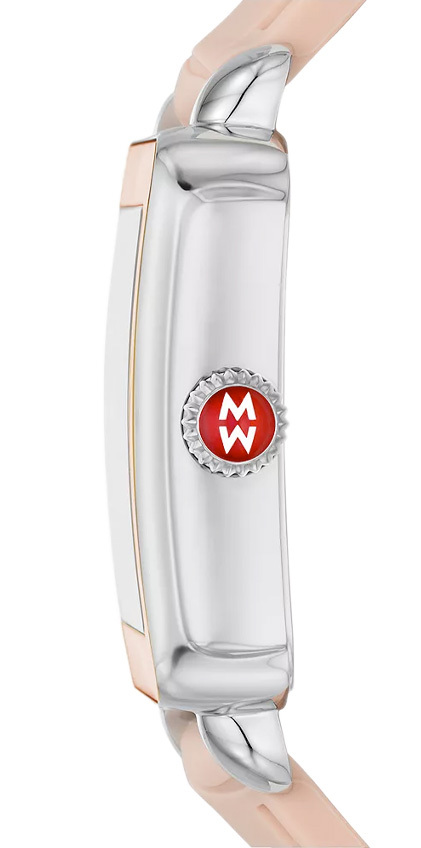 This two-tone Pink Gold Deco Sport offers a sporty, more casual take on the classic Deco with white lum-filled stick indexes on a silver white sunray dial and a pink gold-tone reflector bezel. The Desert Rose embossed silicone strap is interchangeable with any 18mm MICHELE watch.
