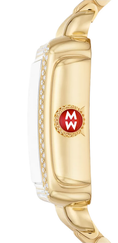 Only 50 pieces were produced of this limited edition piece. The rectangular case of the Deco 18K gold-plated diamond watch reflects the geometric shapes identified with Art Deco architecture. This iconic Swiss timepiece features 575 brilliant hand-set diamonds (2.0 carat weight) along the bezel, pavé dial with 12 beautiful ruby baguettes (0.5 carat weight) on each of the indexes and engraved MICHELE logos within the case walls. An 18K gold-plated hand-set diamond seven-link bracelet adds the finishing touch and is interchangeable with any 18mm MICHELE strap.