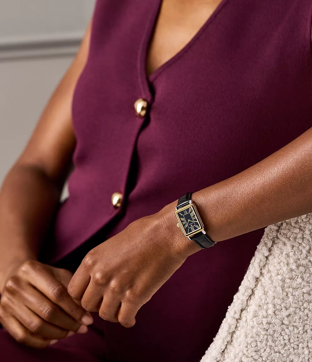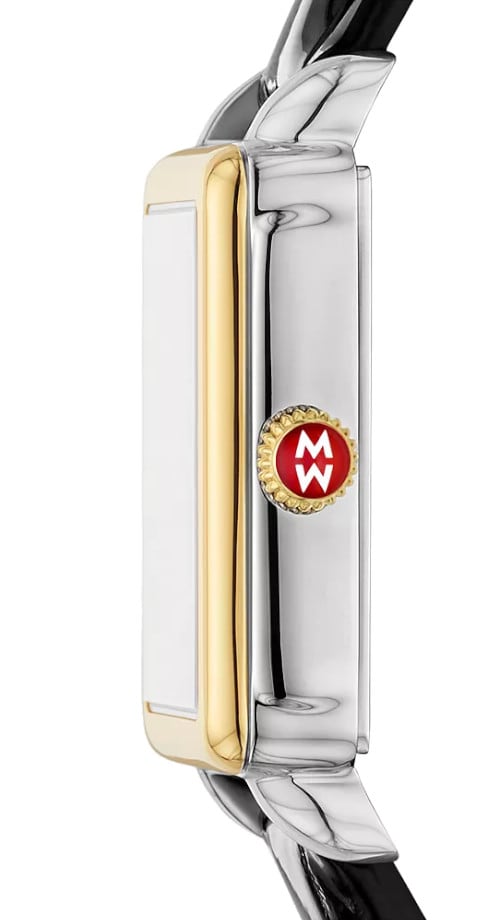 Elegant and architectural, this rectangular watch from the Deco Park collection perfectly balances form and function. The glossy noir dial is housed within a two-tone stainless steel and 18K gold-plated case and Swiss movement. The black leather croco-embossed strap is interchangeable with any 14mm MICHELE strap.