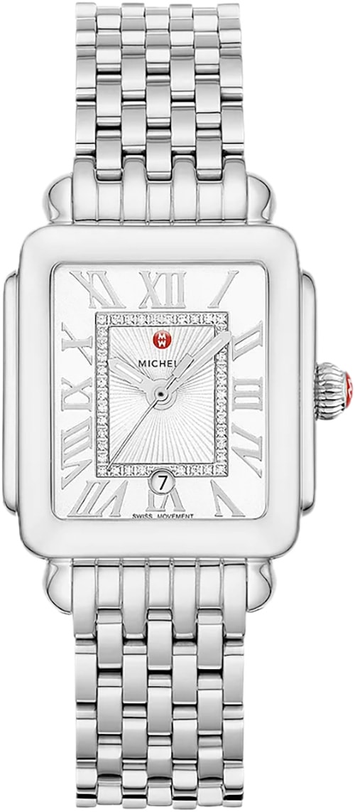 This stainless steel Deco Madison Mid shines with 40 hand-set diamonds atop the silver white sunray dial. The stainless steel bracelet is made specifically for the Deco Madison Mid collection and is interchangeable with any 16mm MICHELE strap.