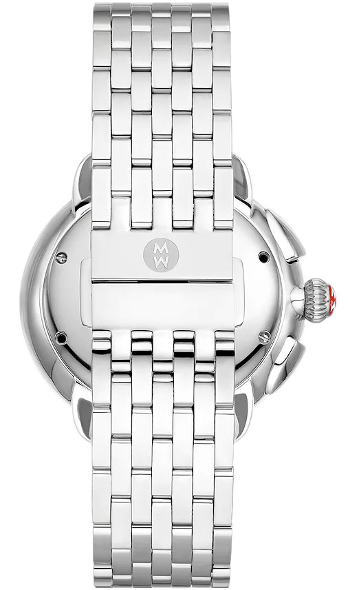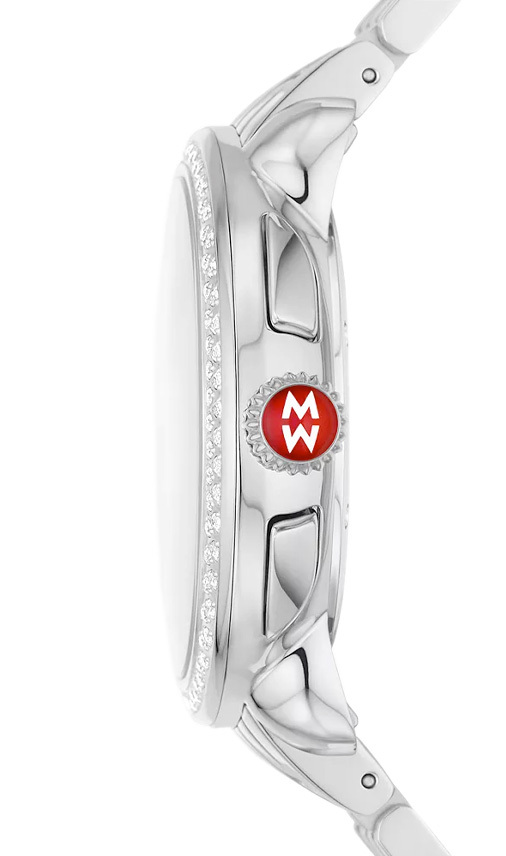 This Serein stainless diamond watch timepiece features chronograph movement, 123 brilliant hand-set diamonds (0.62 carat weight) along the bezel and white mother-of-pearl dial. Paired with a seven-link stainless bracelet, this 18mm bracelet is made specifically for the Serein and is interchangeable with any 18mm MICHELE strap.