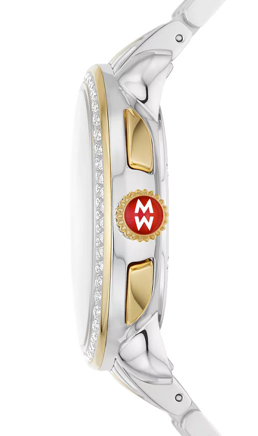 This Serein two-tone 18k gold-plated diamond watch timepiece features a chronograph movement, 123 brilliant hand-set diamonds (0.62 carat weight) along the bezel and white mother-of-pearl dial. Paired with a seven-link two-tone stainless and 18k gold-plated bracelet, this 18mm bracelet is made specifically for the Serein and is interchangeable with any 18mm MICHELE strap.