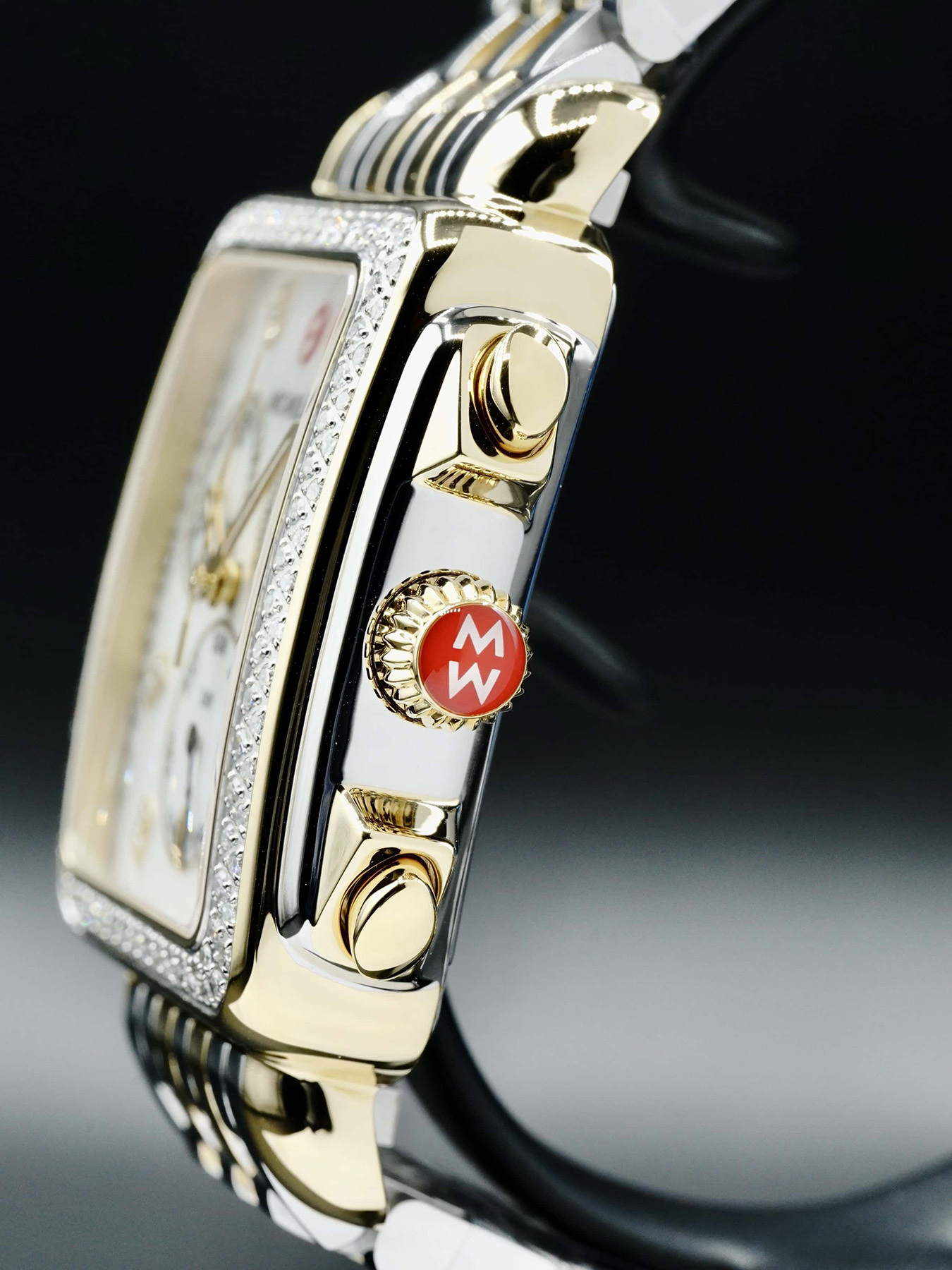 This Michele Deco XL Two-Tone 18k Gold MWW06Z000034 is in EXCELLENT condition. This watch includes its original box and electronic instruction manual. *Factory stickers on bracelet & case back.*